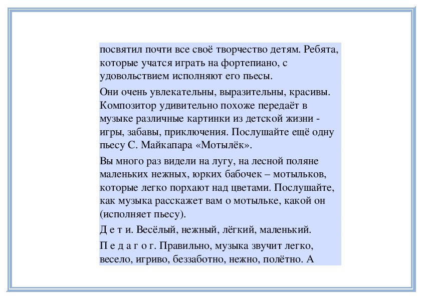 Они очень увлекательны, выразительны, красивы. Композитор удивительно похоже передаёт в музыке различные картинки из детской жизни - игры, забавы, приключения. Послушайте ещё одну пьесу С. Майкапара «Мотылёк».