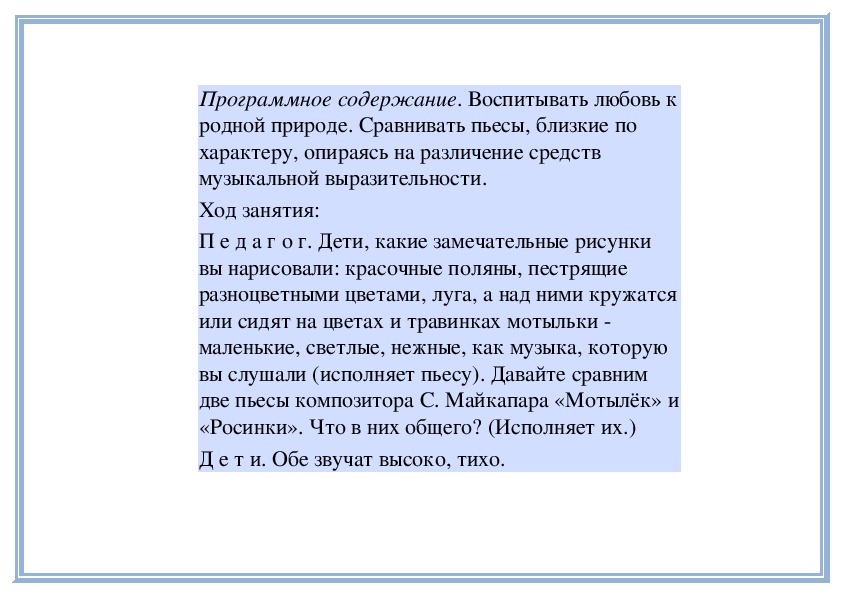 Программное содержание. Рассказать детям о композиторе С. Майкапаре. Вызвать эмоциональную отзывчивость на музыку изобразительного характера - весёлую, беззаботную, игривую.