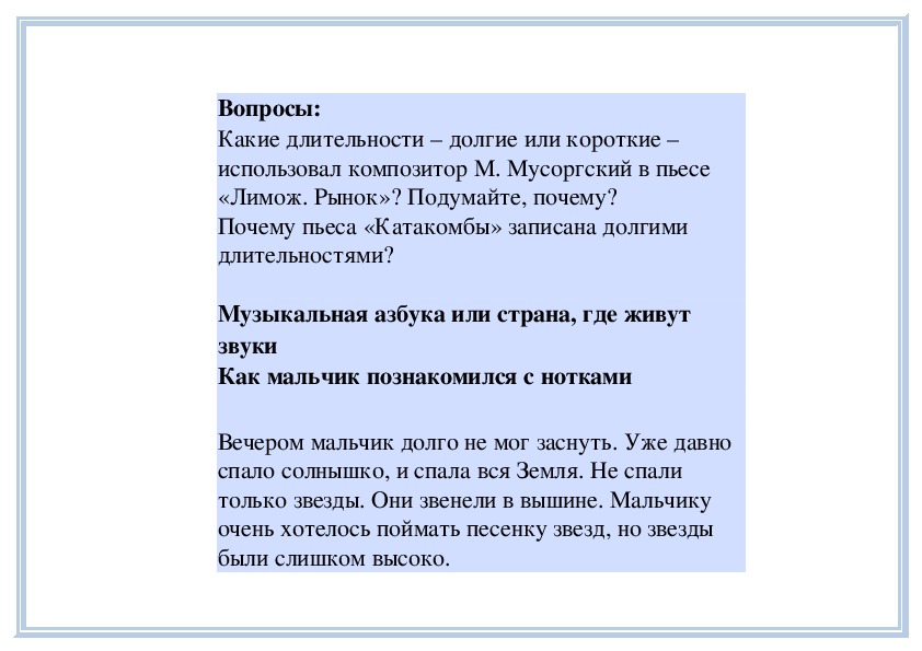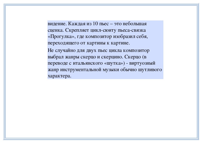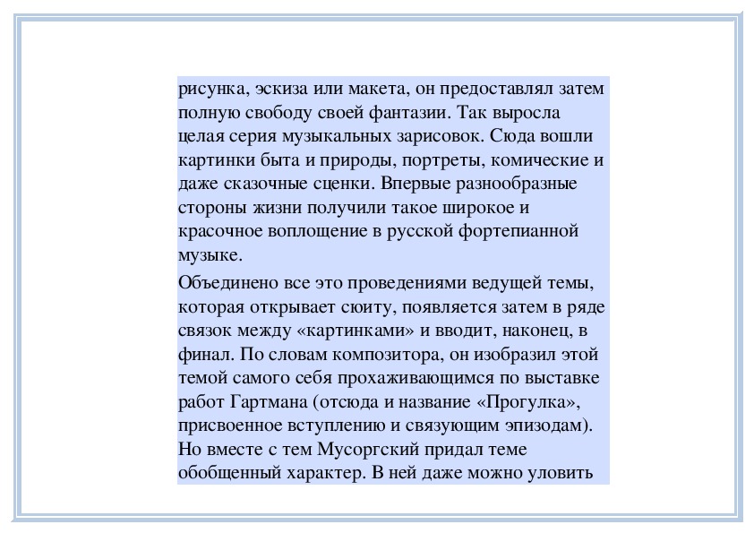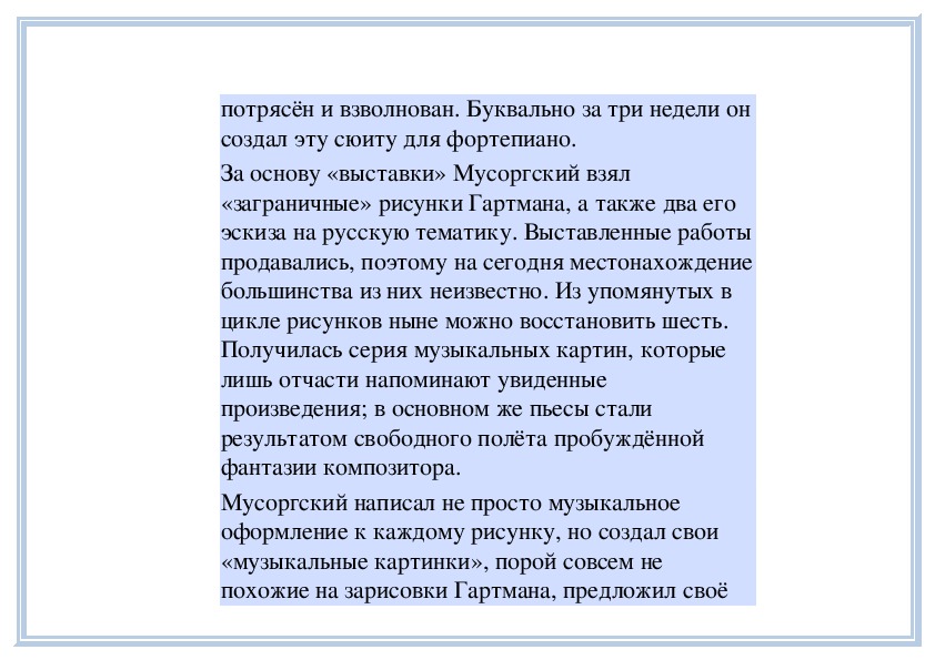 воспоминание об умершем друге.При жизни Мусоргского «Картинки» не издавались