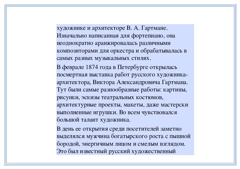 созданная в память о друге Мусоргскогохудожнике и архитекторе В. А. Гартмане.