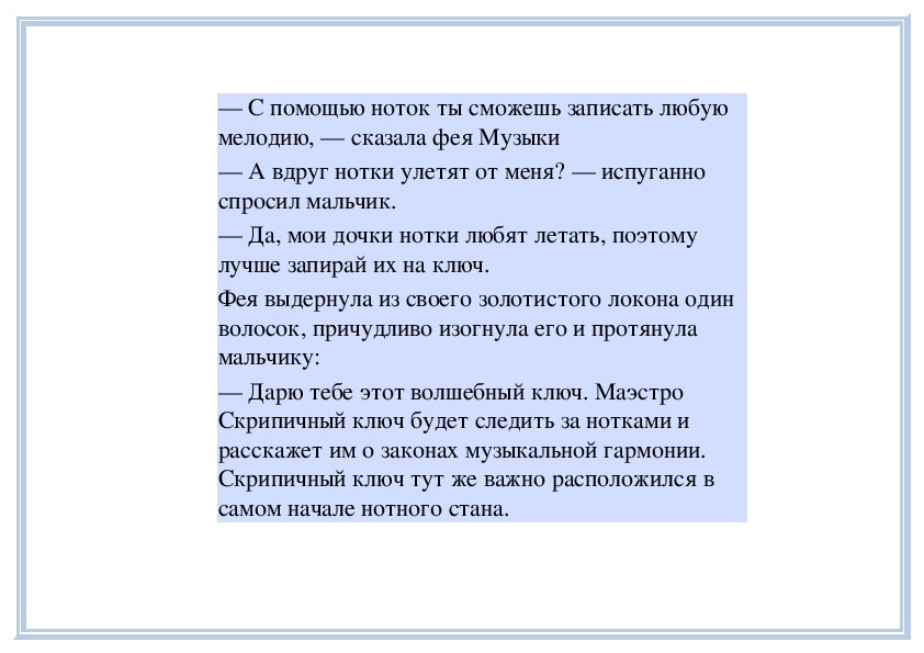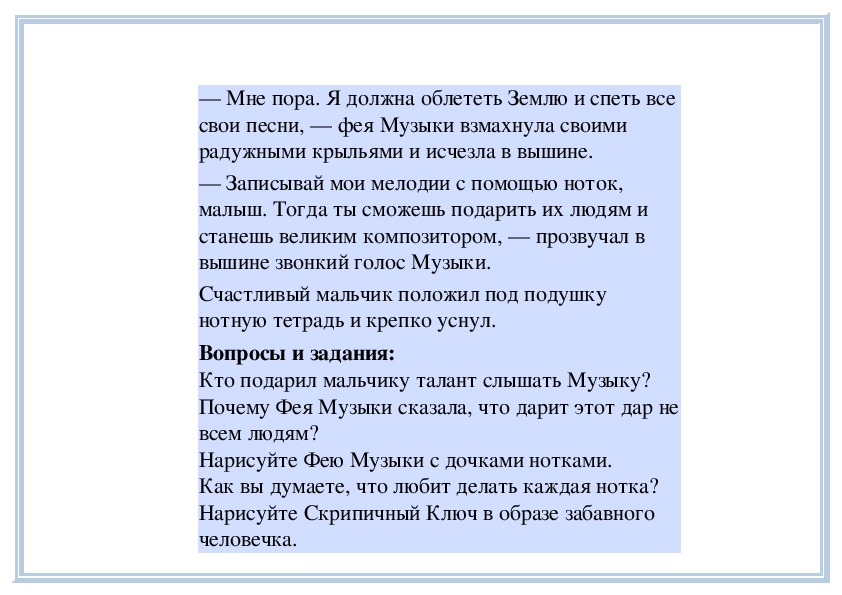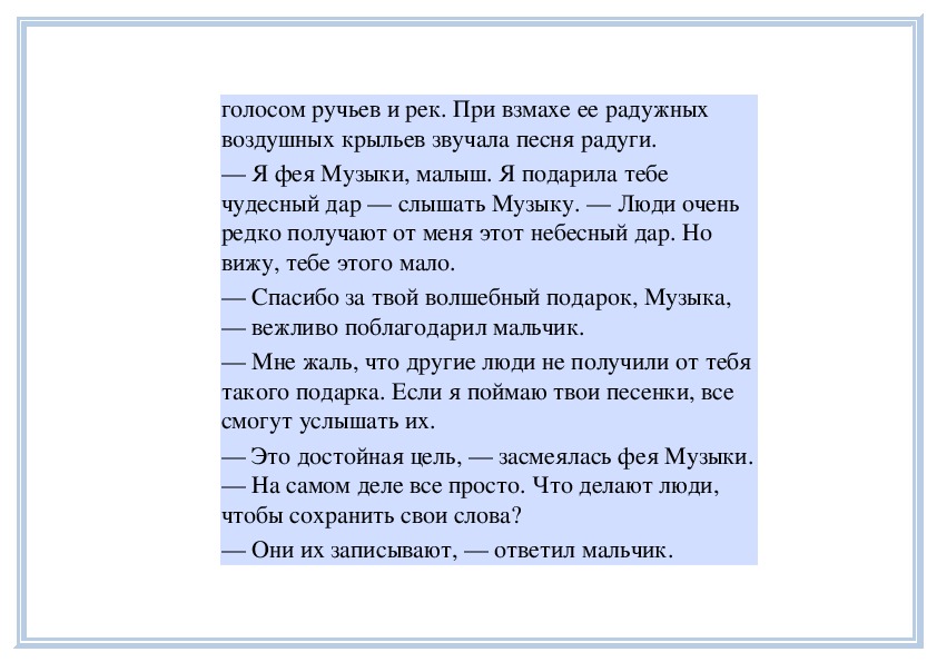 — Я фея Музыки, малыш. Я подарила тебе чудесный дар — слышать Музыку. — Люди очень редко получают от меня этот небесный дар. Но вижу, тебе этого мало.