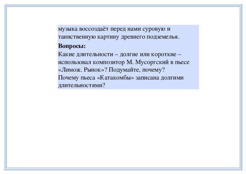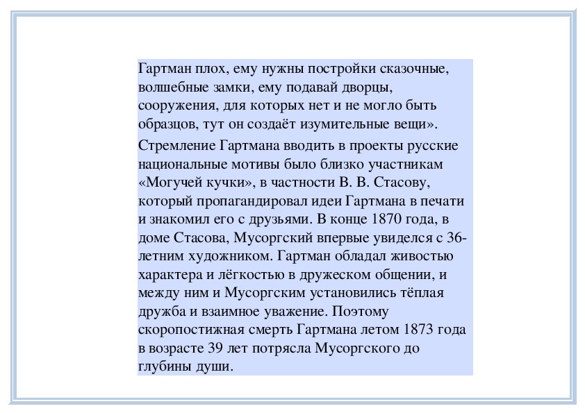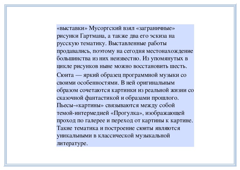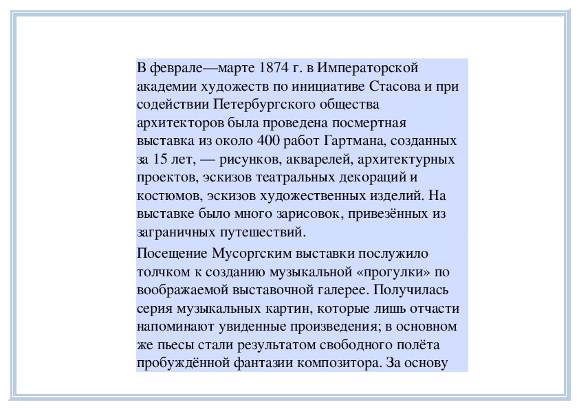 воспоминание об умершем друге.При жизни Мусоргского «Картинки» не издавались