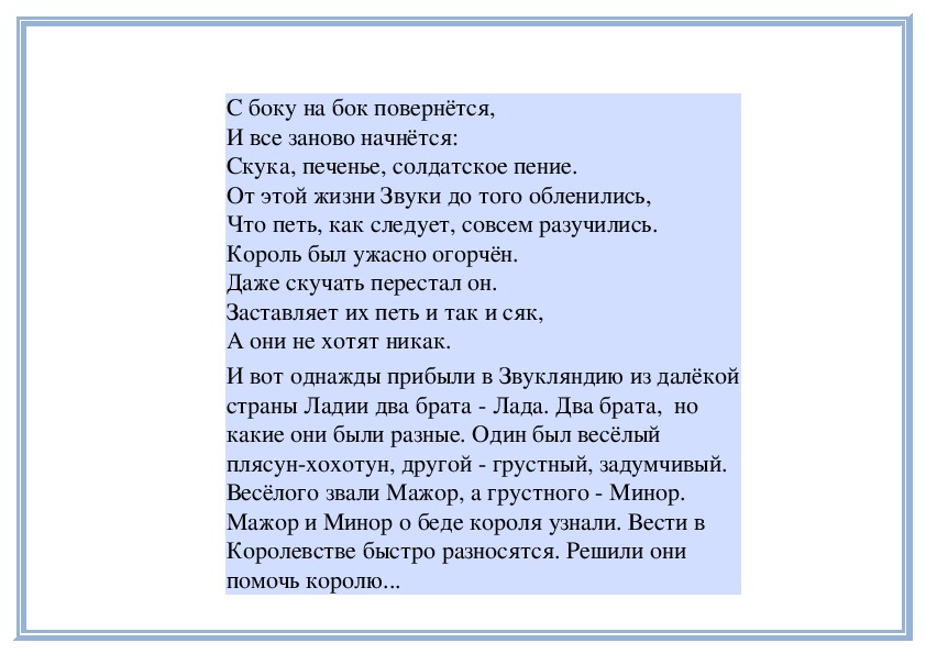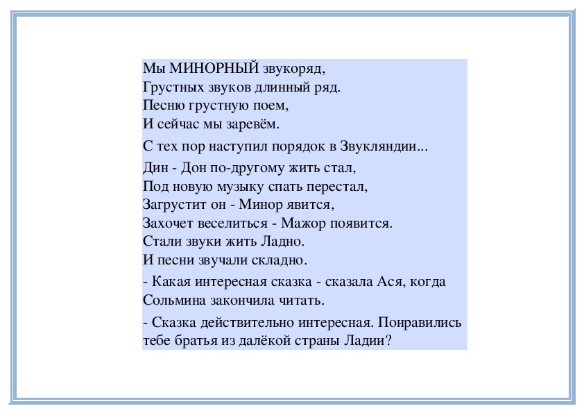 Запевай! скомандовал Минор. Звуки запели:Мы МИНОРНЫЙ звукоряд,