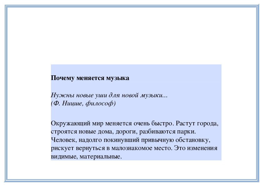 Эту тему мы хотели бы начать с предложения. Дело в том, что речь на этом уроке пойдёт не совсем о музыке, т. е. не об отдельных музыкальных произведениях, которые можно слушать, обсуждать, сравнивать с другими произведениями. Здесь речь пойдёт о множестве всевозможных звучаний, окружающих нашу жизнь. Поэтому было бы интересно, если бы каждый из вас стал музыкальным редактором этого урока, предложил свой собственный вариант его музыкального оформления.