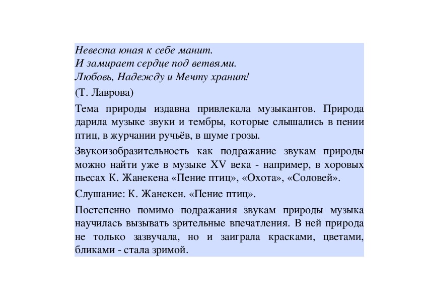 музыкальную ткань, в которой слышится птичье щебетанье.