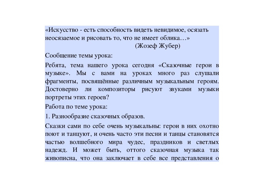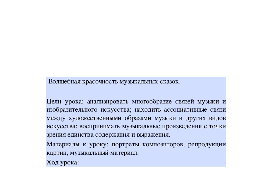 Цели урока: анализировать многообразие связей музыки, литературы и изобразительного искусства; рассуждать о яркости и контрастности образов в музыке; ориентироваться в специфике выразительных средств музыки (с учётом критериев, представленных в учебнике).