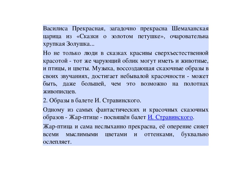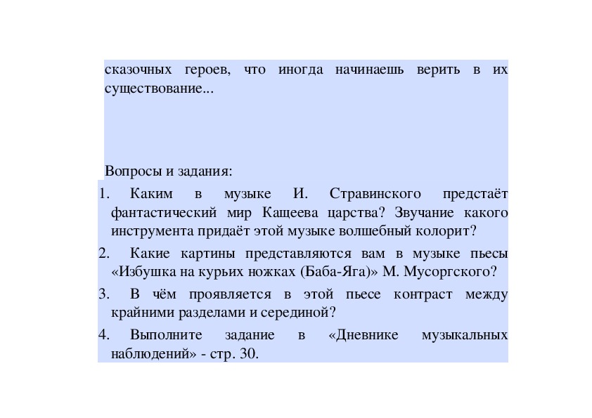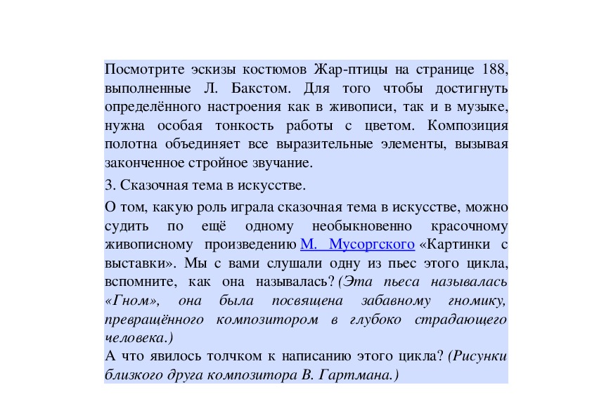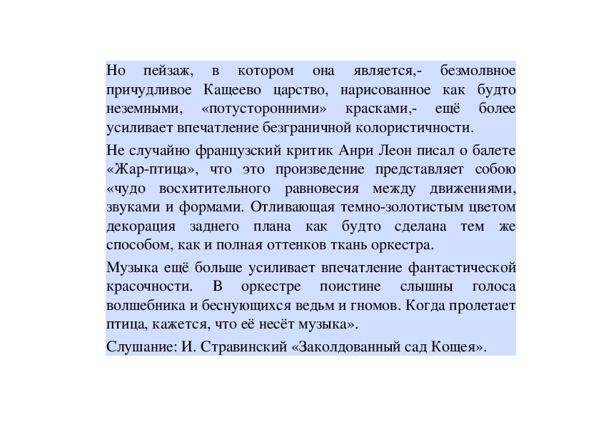 Слушание: И. Стравинский «Заколдованный сад Кощея».Посмотрите эскизы костюмов Жарптицы на странице 188,