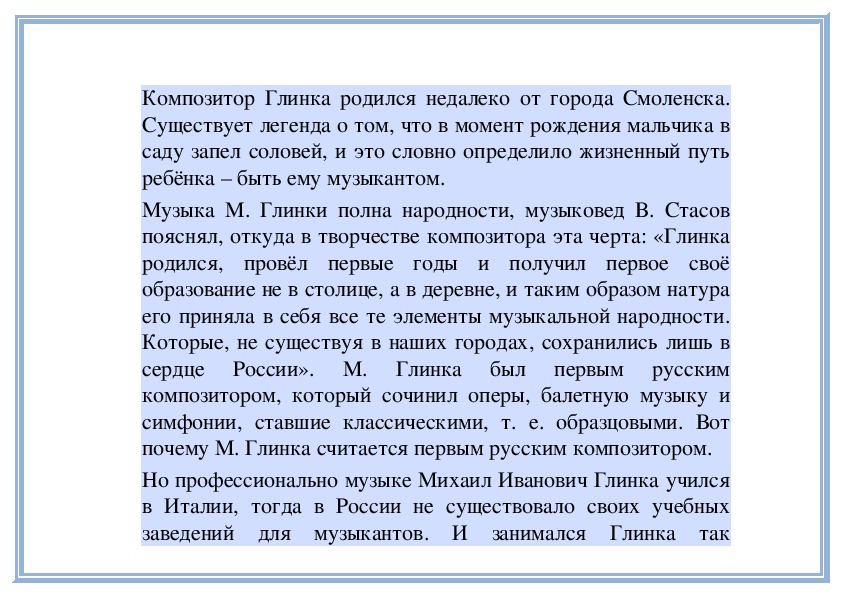 Глинка создал основы русского музыкального языка.Композитор Глинка родился недалеко от города Смоленска.