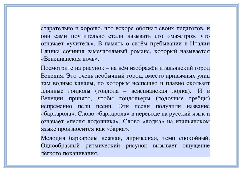 М. Глинки «Венецианская ночь». В музыке романса вы