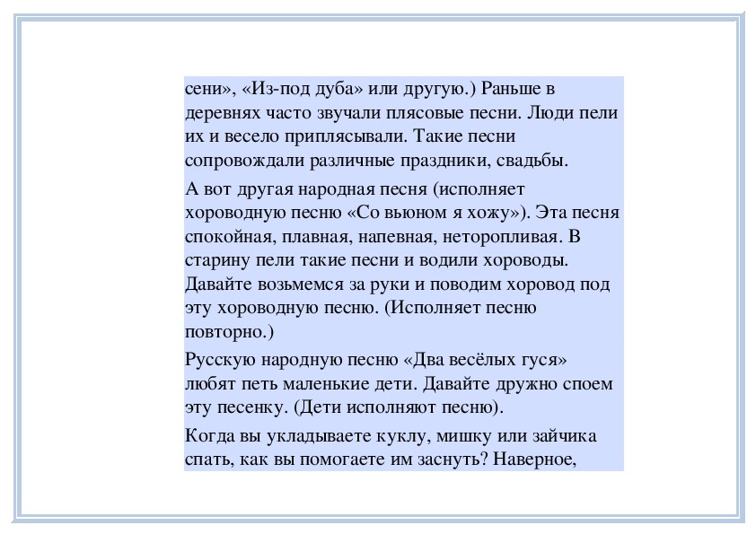 когда грустно. (Поет плясовую песню «Ах вы,сени», «Изпод дуба» или другую.) Раньше в