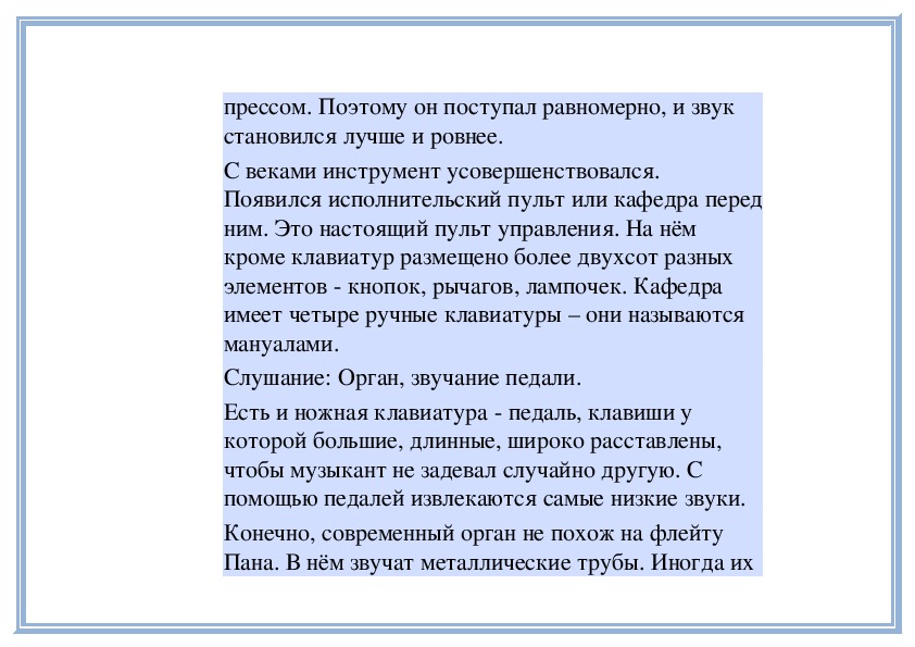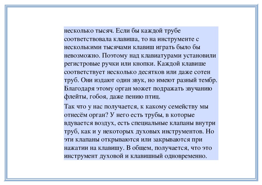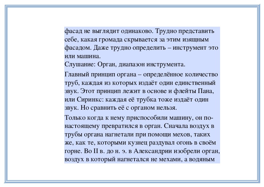 Орган. Конечно, вы знаете этот инструмент. Его называют королём музыкальных инструментов и обращаются к нему: «Его величество орган». То, что нам видно из зала, называется фасадом органа. Он состоит из нескольких десятков труб. Они расположены несколькими группами, а в каждой группе ещё и выстроены по росту, образуя по-настоящему неповторимое художественное произведение. Потому что ни в каком другом зале фасад не выглядит одинаково. Трудно представить себе, какая громада скрывается за этим изящным фасадом. Даже трудно определить – инструмент это или машина.