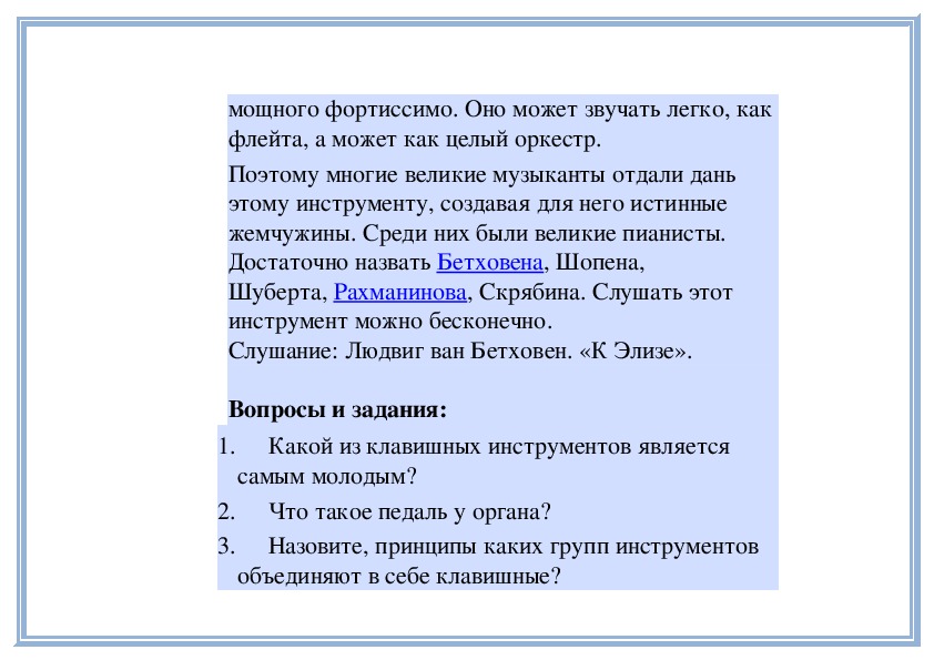 Итак, мы с вами выяснили, что по способам извлечения звука музыкальные инструменты делятся на три больших семейства: струнные, духовые и ударные. Но есть музыкальные инструменты, которые как бы не укладываются в обычные рамки.