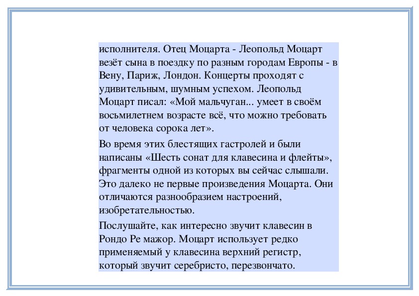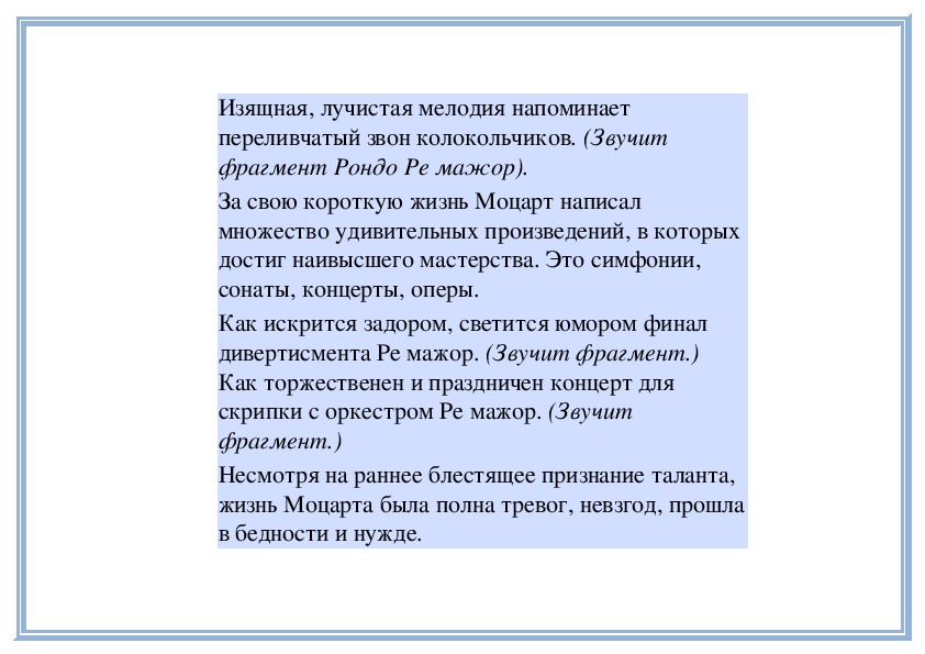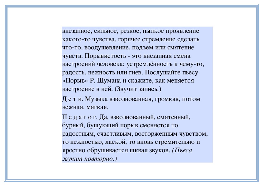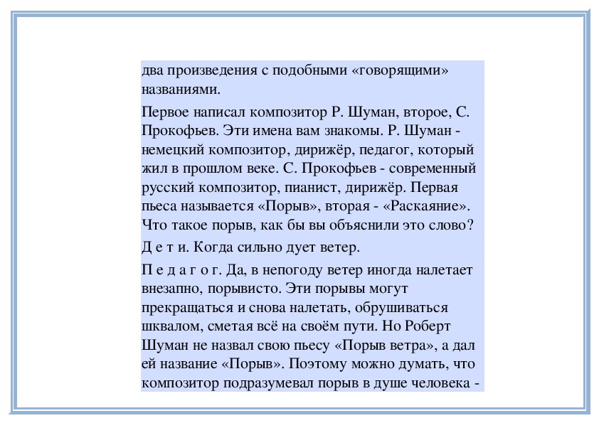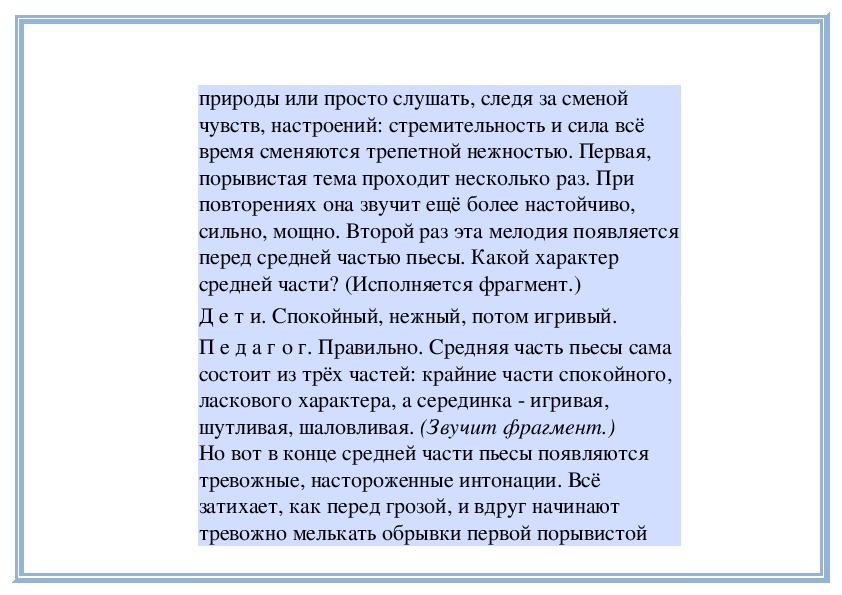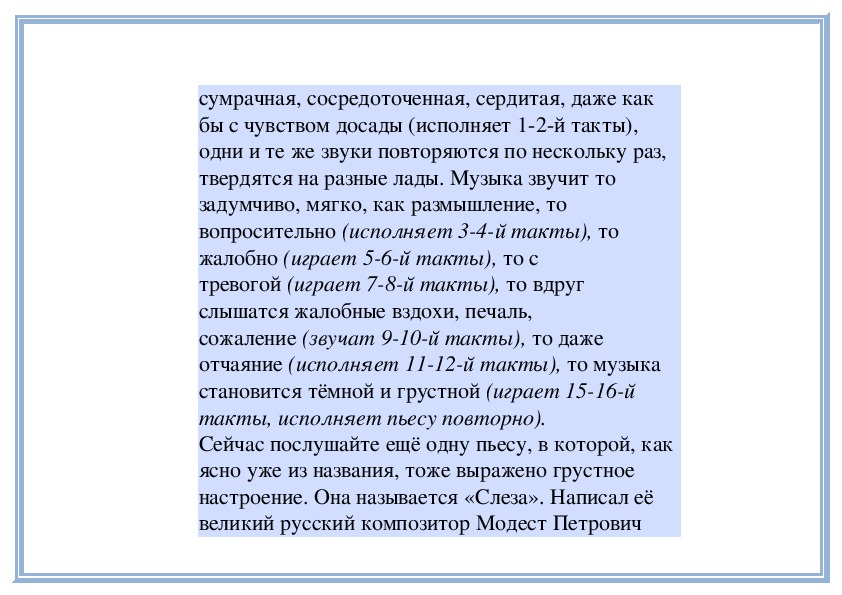 П е д а г о г. В любом музыкальном произведении выражены чувства, переживания, настроения человека. Иногда уже само название пьесы указывает на те или иные настроения. Например, «Тревожная минута», «Раздумье» С. Майкапара, «Ласковая просьба» Г. Свиридова, «Материнские ласки» А. Гречанинова и многие другие. Грусть, радость, нежность, беспокойство, тревога и другие чувства выражены в них. Сегодня вы услышите ещё два произведения с подобными «говорящими» названиями.