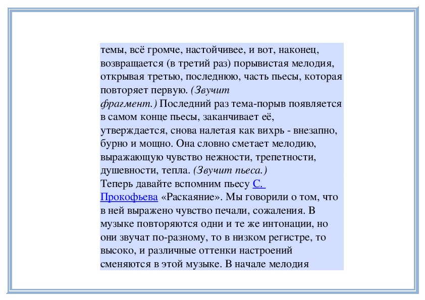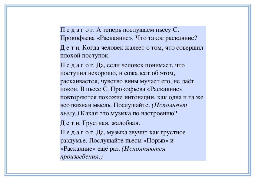 звучит повторно.)П е д а г о г. А теперь послушаем пьесу С.