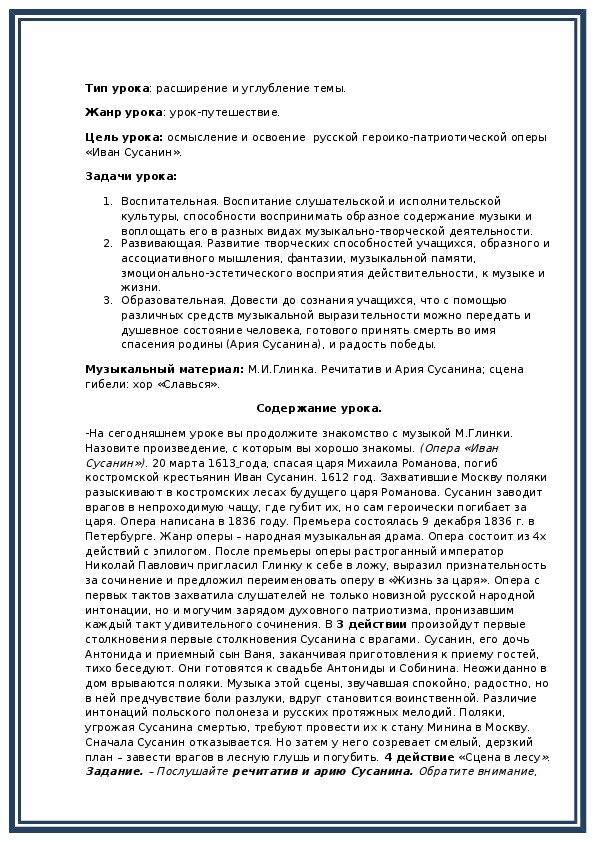 Урок музыки в 4 классе. Тема четверти: «Музыка моего народа». Тема урока: «Тема Отечества в народной и композиторской музыке». Тип урока: расширение и углубление темы. Жанр урока: урок-путешествие. Цель урока: осмысление и освоение русской героико-патриотической оперы «Иван Сусанин». Музыкальный материал: М.И.Глинка. Речитатив и Ария Сусанина; сцена гибели: хор «Славься». Содержание урока. -На сегодняшнем уроке вы продолжите знакомство с музыкой М.Глинки. Назовите произведение, с которым вы хорошо знакомы. (Опера «Иван Сусанин»). 20 марта 1613 года, спасая царя Михаила Романова, погиб костромской крестьянин Иван Сусанин. 1612 год. Захватившие Москву поляки разыскивают в костромских лесах будущего царя Романова. Сусанин заводит врагов в непроходимую чащу, где губит их, но сам героически погибает за царя. Опера написана в 1836 году. Премьера состоялась 9 декабря 1836 г. в Петербурге. Жанр оперы – народная музыкальная драма. Опера состоит из 4х действий с эпилогом. После премьеры оперы растроганный император Николай Павлович пригласил Глинку к себе в ложу, выразил признательность за сочинение и предложил переименовать оперу в «Жизнь за царя». Опера с первых тактов захватила слушателей не только новизной русской народной интонации, но и могучим зарядом духовного патриотизма, пронизавшим каждый такт удивительного сочинения. В 3 действии произойдут первые столкновения первые столкновения Сусанина с врагами. Сусанин, его дочь Антонида и приемный сын Ваня, заканчивая приготовления к приему гостей, тихо беседуют. Они готовятся к свадьбе Антониды и Собинина. Неожиданно в дом врываются поляки. Музыка этой сцены, звучавшая спокойно, радостно, но в ней предчувствие боли разлуки, вдруг становится воинственной. Различие интонаций польского полонеза и русских протяжных мелодий. Поляки, угрожая Сусанина смертью, требуют провести их к стану Минина в Москву. Сначала Сусанин отказывается. Но затем у него созревает смелый, дерзкий план – завести врагов в лесную глушь и погубить. 4 действие «Сцена в лесу». Задание. – Послушайте речитатив и арию Сусанина. Обратите внимание, чем она начинается, как развивается. Меняется ли настроение музыки? С чем это связано? Здесь достаточно ярким становится контраст между силой Сусанина и одновременно его глубокой скорбью, печалью. Песенный характер арии. -Каким представился вам Сусанин в этот час? (Спойте эпизоды из арии. Обратите внимание на протяжные, взволнованные распевы). Мужественный характер образа передан мелодиями, написанными в духе русских протяжных песен (связь героя с народом, его чувствами и мыслями). Ария написана в 3х частной форме. Знакомство с хором «Славься». Куплетная форма. Хор передает торжество и ликование. Враг побежден. Красная площадь в Москве заполнена народом, приветствующим русские войска. Победно, величаво звучит хор. Неожиданным контрастом звучит тема скорби и печали – память о погибших. Задания. Пение мелодии хора; слушание хора. Беседа о прослушанных фрагментах. -Какими средствами Глинка передал радость победы? Что придает этой сцене торжественность и праздничность? (Мажор, быстрый темп, громкая динамика, медные духовые, колокольный звон). - Вы прослушали два значимых эпизода оперы. Почему они по разному воспринимаются? В чем сила их музыки? (В арии Сусанина красивы его мужество, благородст