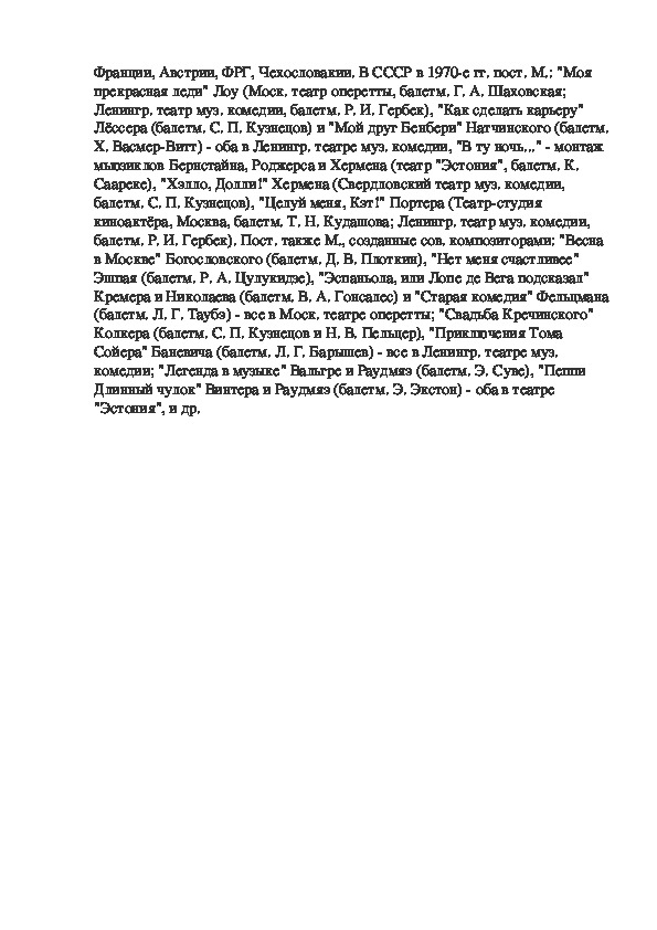 уровнем хореографии, в Великобритании ("Оливер" Барта, балетм. О. Уайт),Франции, Австрии, ФРГ, Чехословакии. В СССР в 1970е гг. пост. М.: "Моя