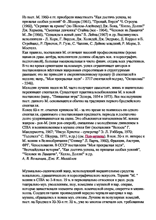Музыкально-сценический жанр, использующий выразит. средства музыки, драм., хореографич. и оперного иск-в. Их сочетание и взаимосвязь придали М. особую динамичность; характерной чертой мн. М. стало решение серьёзных драматургич. задач несложными для восприятия художеств. средствами. Возникновение М. связывают со сложившимися в последней трети 19 в. амер. театр.-муз. формами "увеселений" и "экстраваганц". Экстраваганца "Мрачный жулик", показанная в т-ре Ниблос Гарден (Бродвей, Нью-Йорк) в 1866 и продержавшаяся на сцене четверть века, вызвав серию подражаний, уже имела нек-рые признаки М. Своеобразными бурлескными приёмами (вплоть до цирковых номеров) отличались пост. с музыкой У. К. Кука, в к-рых участвовали негр. артисты Б. Уильямс, Д. Уокер.