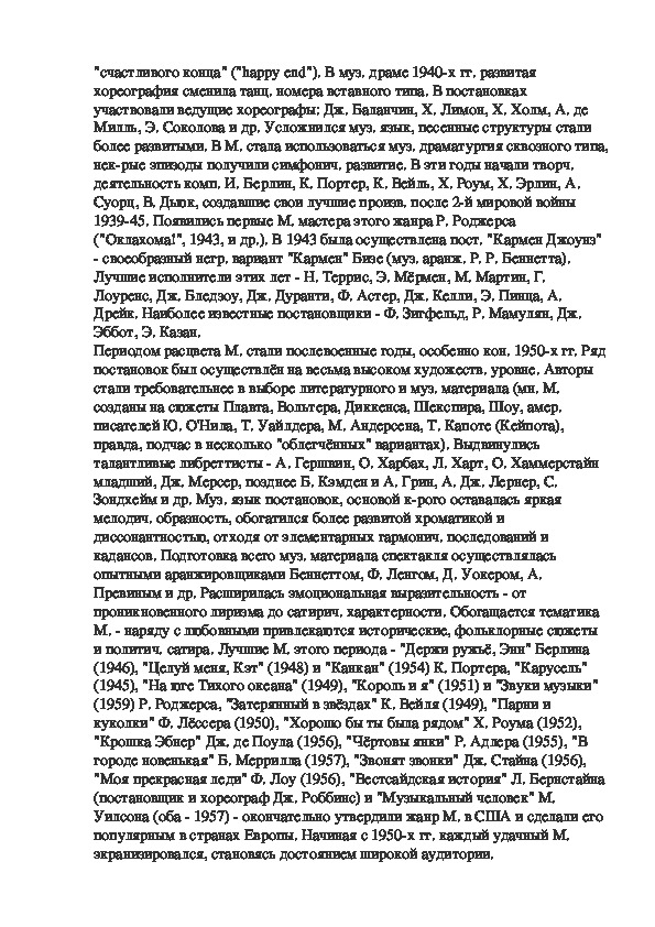 проблемам, подчас завершались трагич. развязкой вместо традиц."счастливого конца" ("happy end"). В муз. драме 1940х гг. развитая