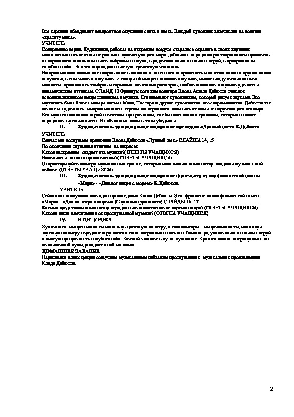 Музыкальный материал: Клод Дебюсси прелюдия «Лунный свет», фрагмент симфонической сюиты «Море»- «Диалог ветра с морем » , пьеса из цикла «Эстампы» - «Сады под дождем»