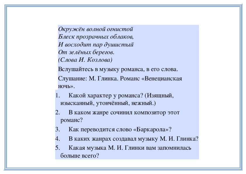 1. М. Глинка, стихи И. Козлова. «Венецианская