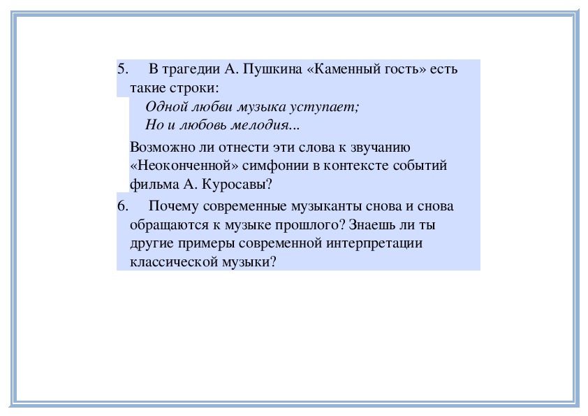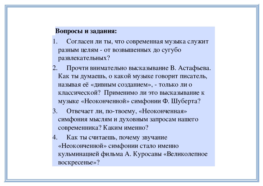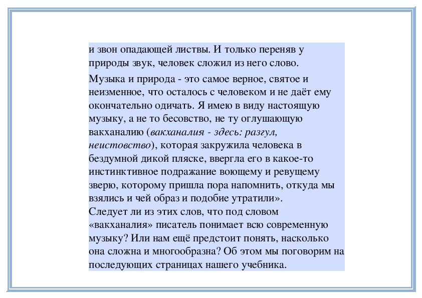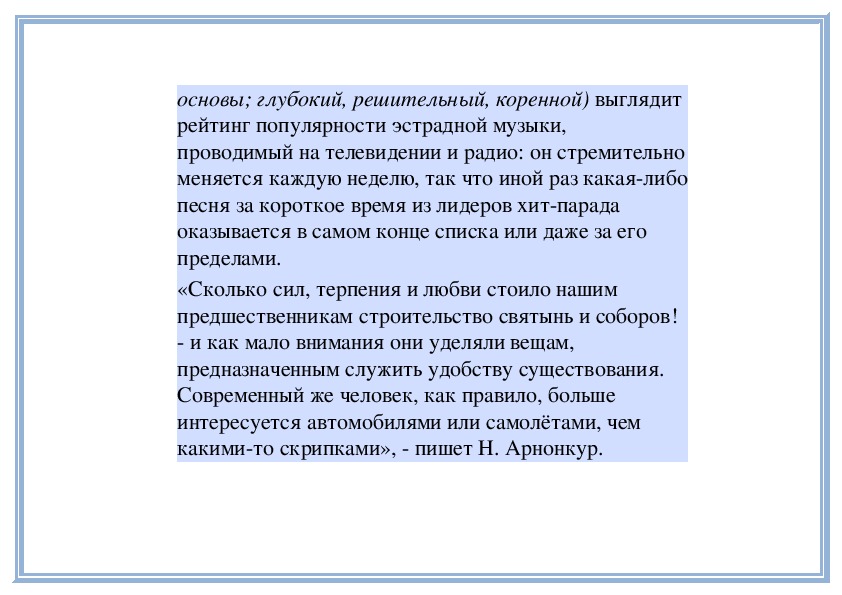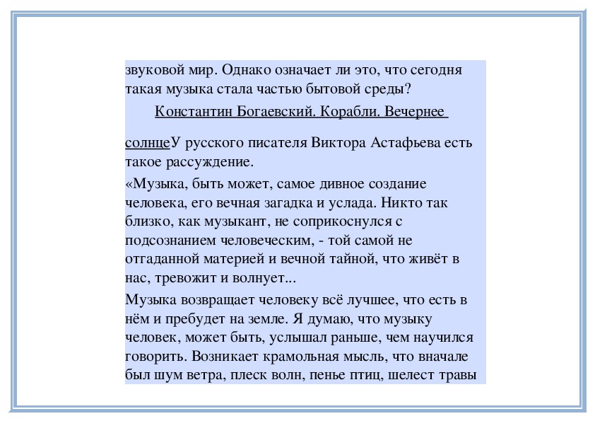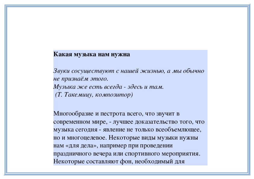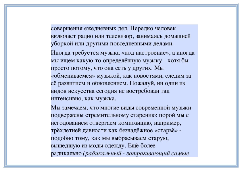 Давайте снова обратимся к противопоставлению «классическое – современное» и задумаемся над тем, что же всё-таки представляет собой «современная музыка». Можем ли мы считать, что это понятие исчерпывается только теми видами, которые служат пользе или комфорту? Не бывает ли в жизни любого человека ситуации, когда он нуждается в музыке не просто как в украшении, а ищет присущих ей глубоких смыслов? К какой музыке он обращается в подобных случаях?