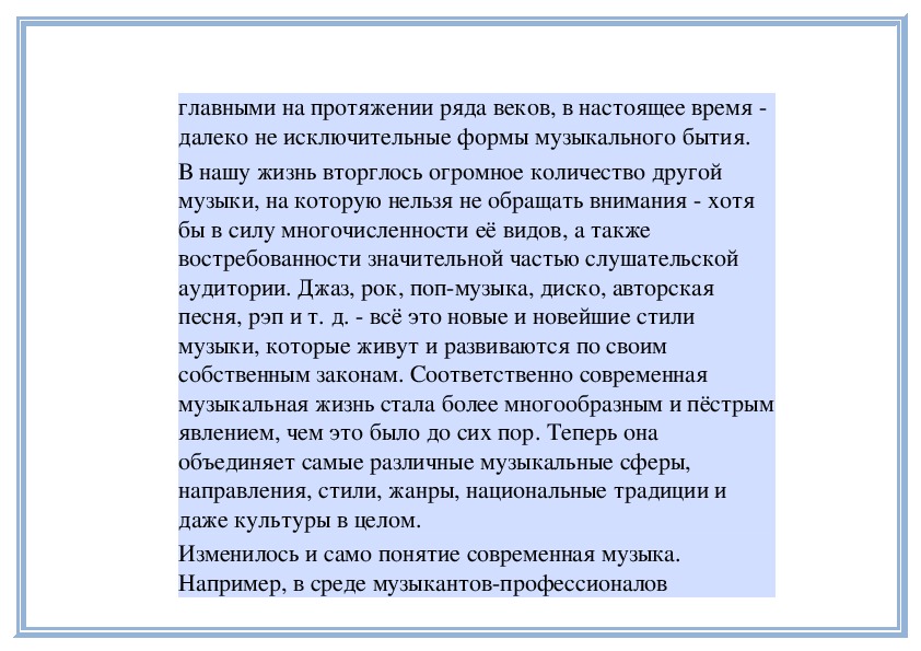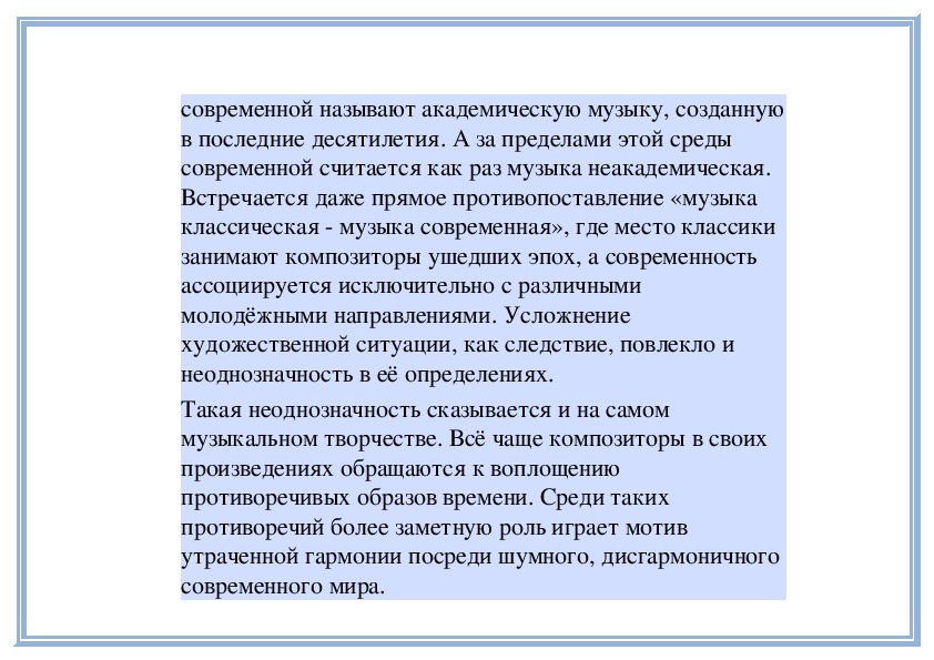 Например, в среде музыкантовпрофессионаловсовременной называют академическую музыку, созданную