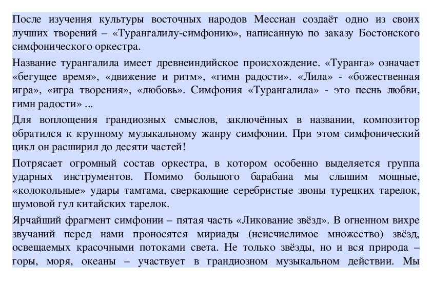 горы, моря, океаны – участвует в грандиозном музыкальном действии. Мынаблюдаем космическую игру, по словам Мессиана, «ослепительную, безмерную,