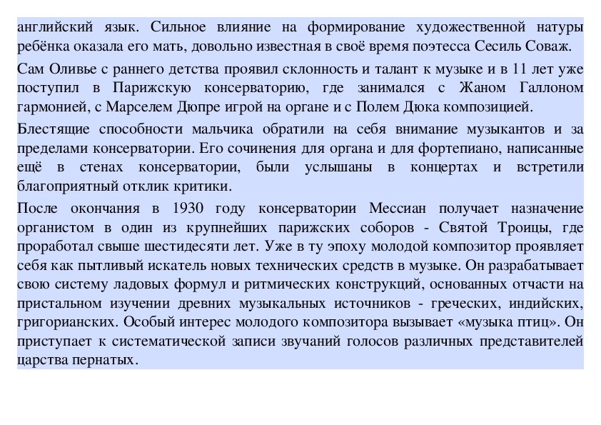григорианских. Особый интерес молодого композитора вызывает «музыка птиц». Он