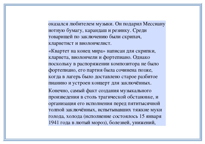 Один из немецких офицеров из лагерной охраныоказался любителем музыки. Он подарил Мессиану