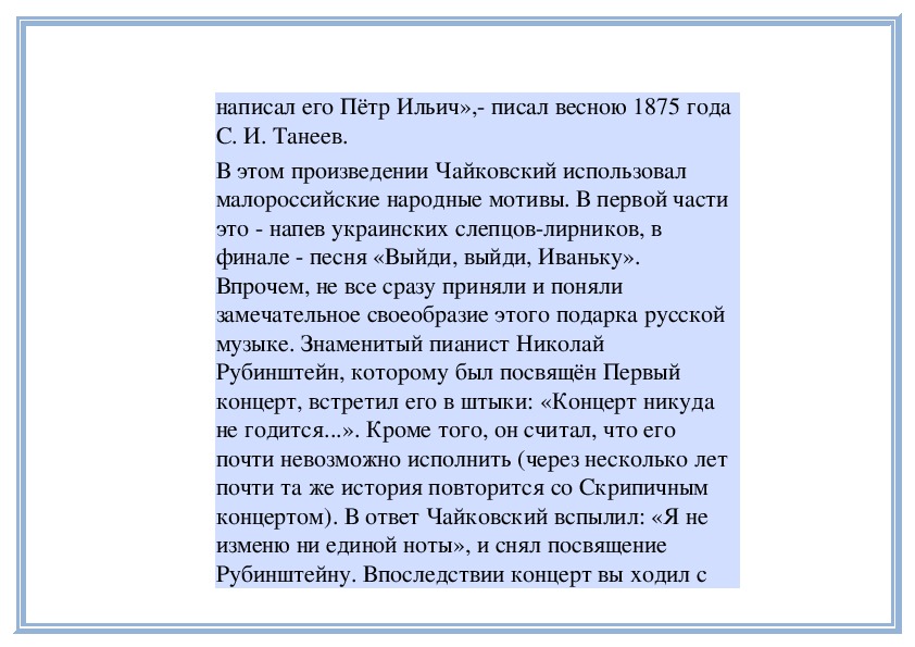 первым русским фортепианным концертом,написал его Пётр Ильич», писал весною 1875 года
