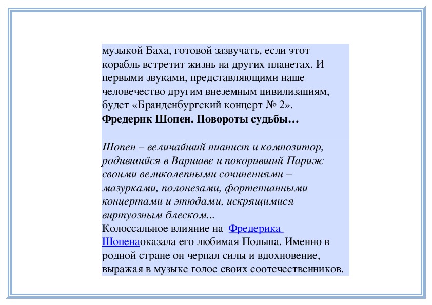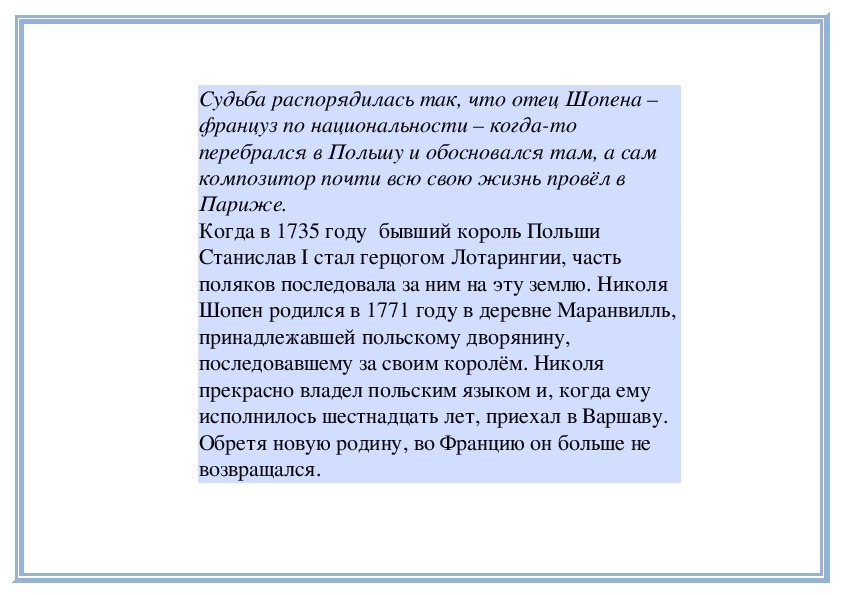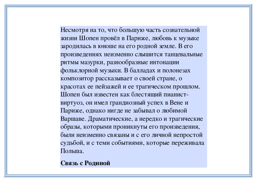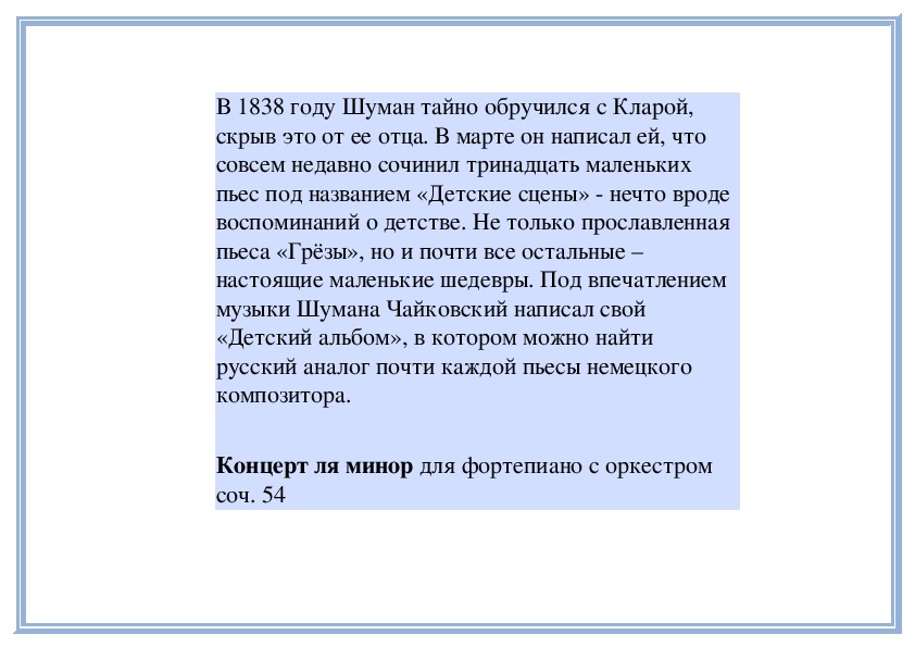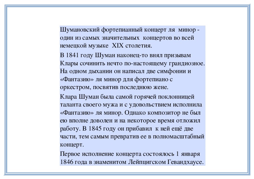 Первый фортепианный концерт Чайковского стал действительно первым - первым образцом национальной классики в концертном жанре. Уже были созданы концерты Рубинштейна - талантливые, блестящие. Но это ещё не было в полной мере русской классикой.