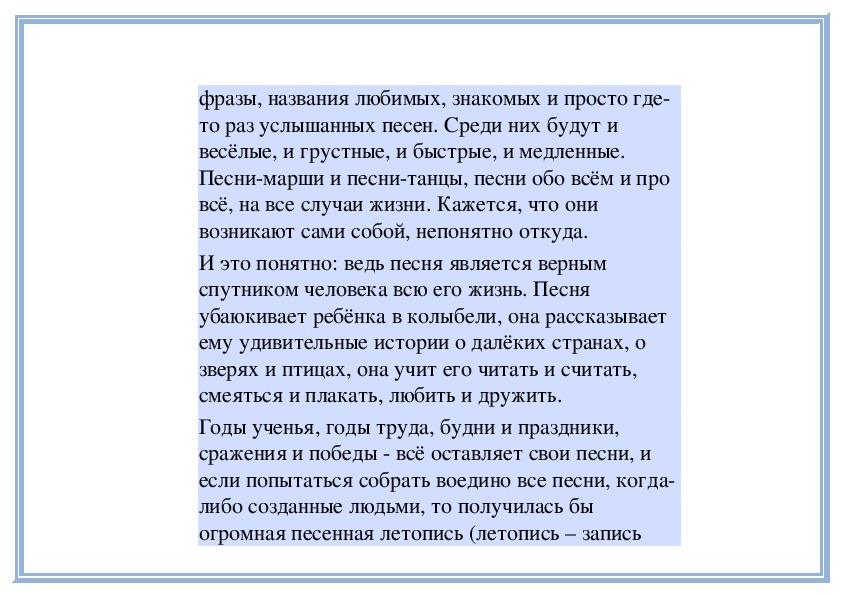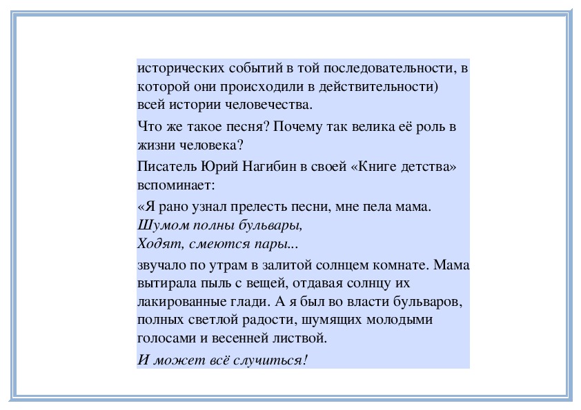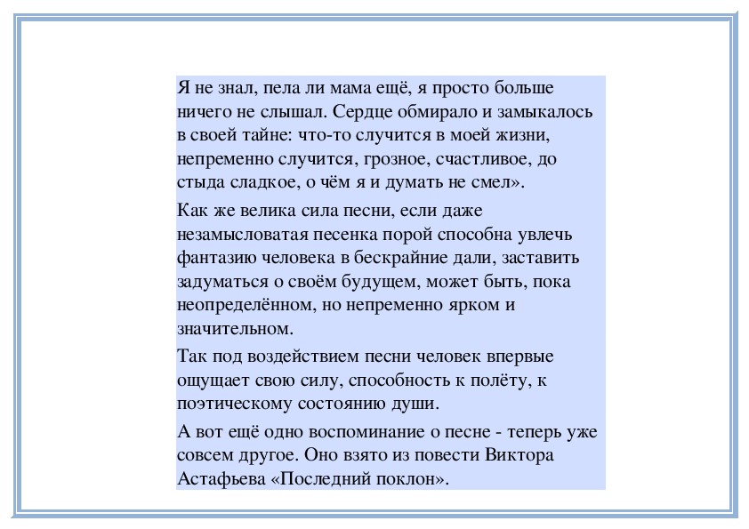 2. Песни детства, их особое значение для каждого человека (на примере литературных фрагментов из воспоминаний Ю. Нагибина и В. Астафьева).