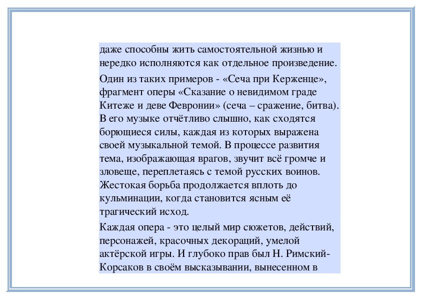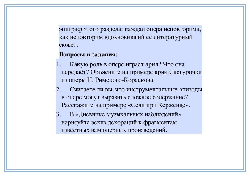 Корсаков в своём высказывании, вынесенном вэпиграф этого раздела: каждая опера неповторима,