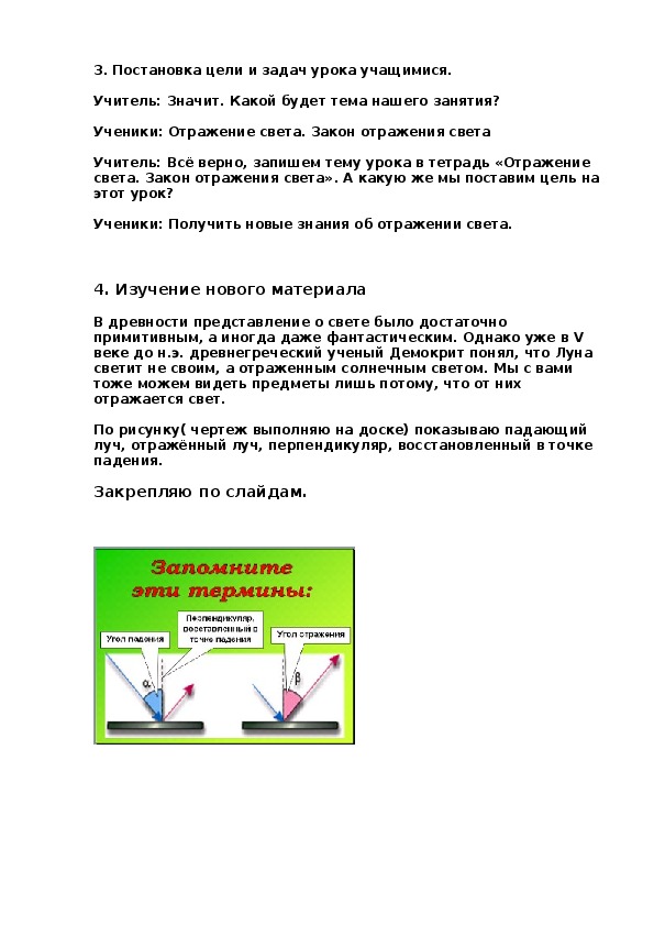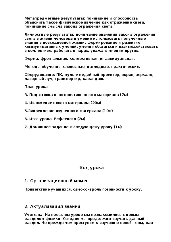 Тема урока"Отражение света.Закон отражения света" Тип урока:открытие нового знания.Цель урока:познакомить с явлением отражения света и законами,которым подчиняется это явление. Задачи урока-образовательные,воспитательные развивающие.На уроке дается определение что такое свет,источники света.На природных явлениях объясняется появление тени,отражение света и распространение света в различных средах.Проводится практическая работа на изучение закона отражения света.Изучается понятия зеркального и диффузного отражения.В конце урока проводится самостоятельная работа.разработка урока по физике 8 кл