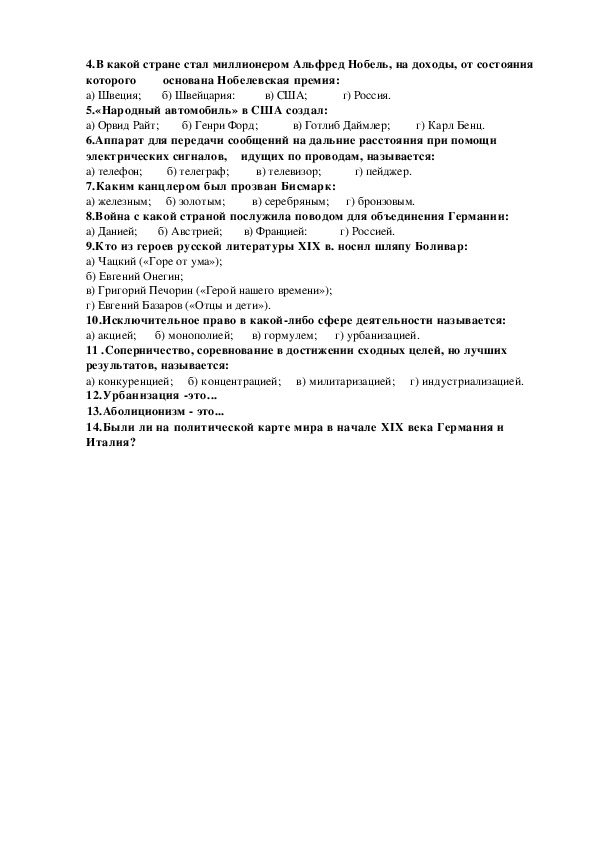 Нового времени II периода. У вас на столах лежат тесты «Мир в XIX веке». Я предлагаю