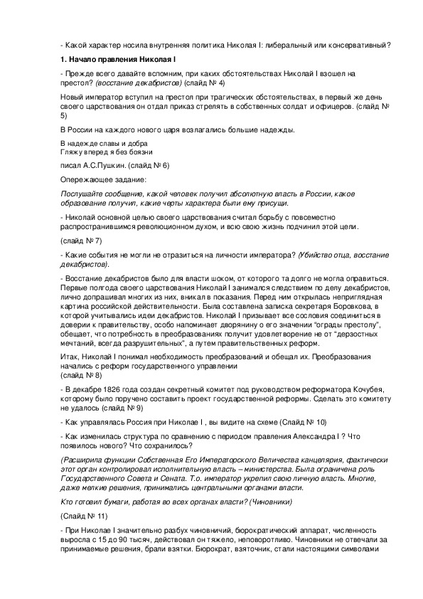 А в конце урока ответить на вопрос (слайд № 3) Какой характер носила внутренняя политика Николая I: либеральный или консервативный?