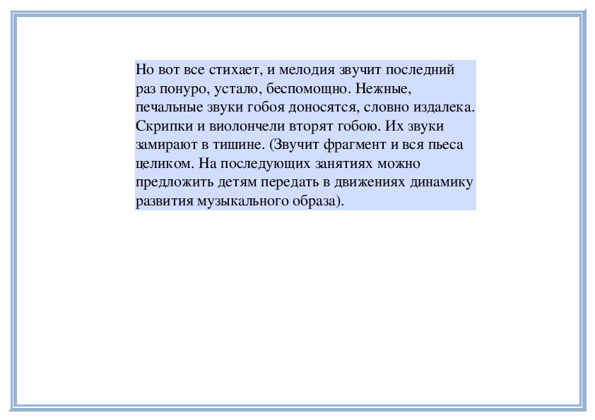Д е т и. Ласковая, спокойная, чутьчуть грустная.П е д а г о г. Правильно, музыка спокойная,
