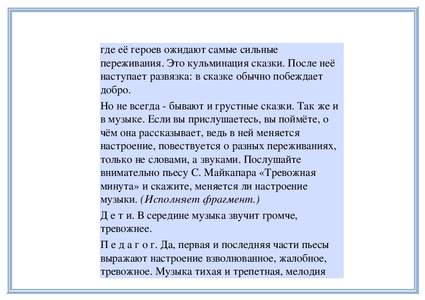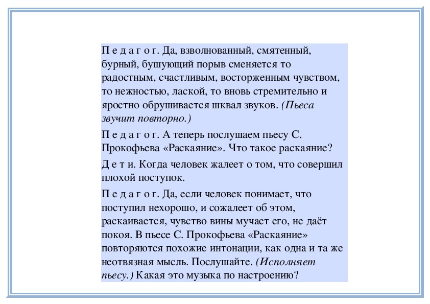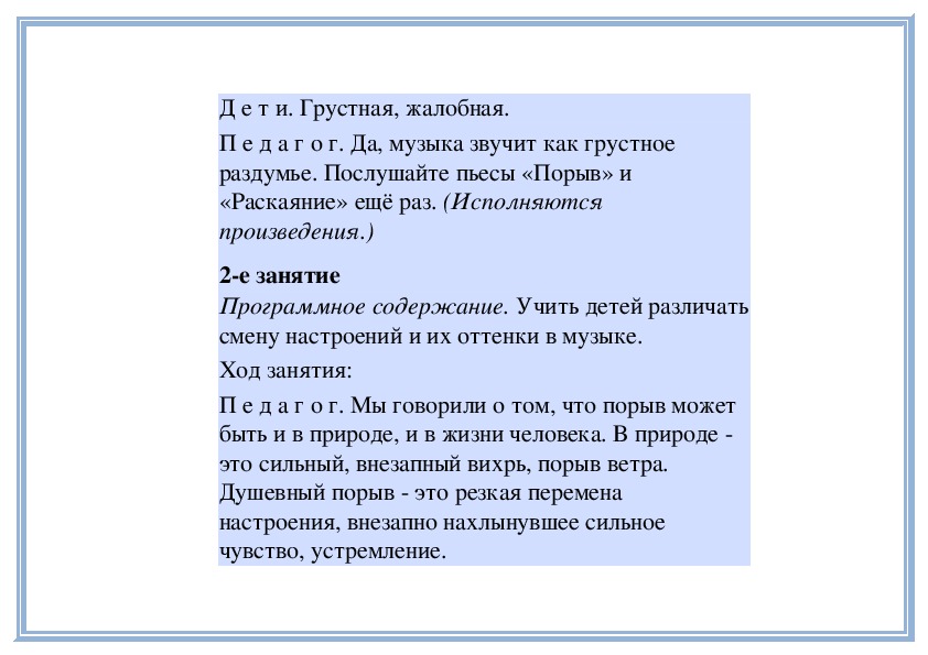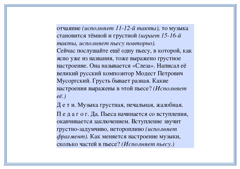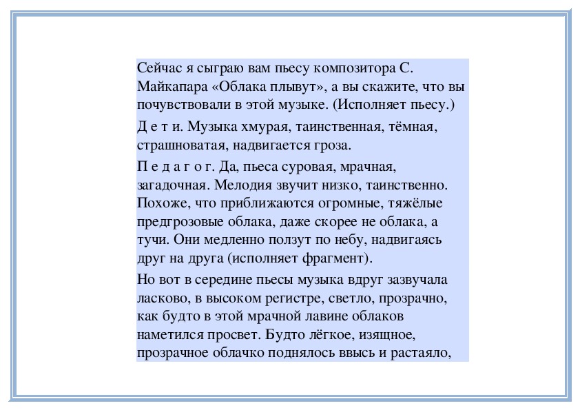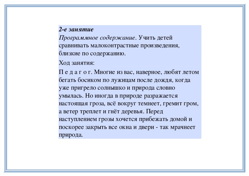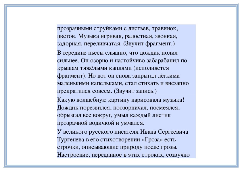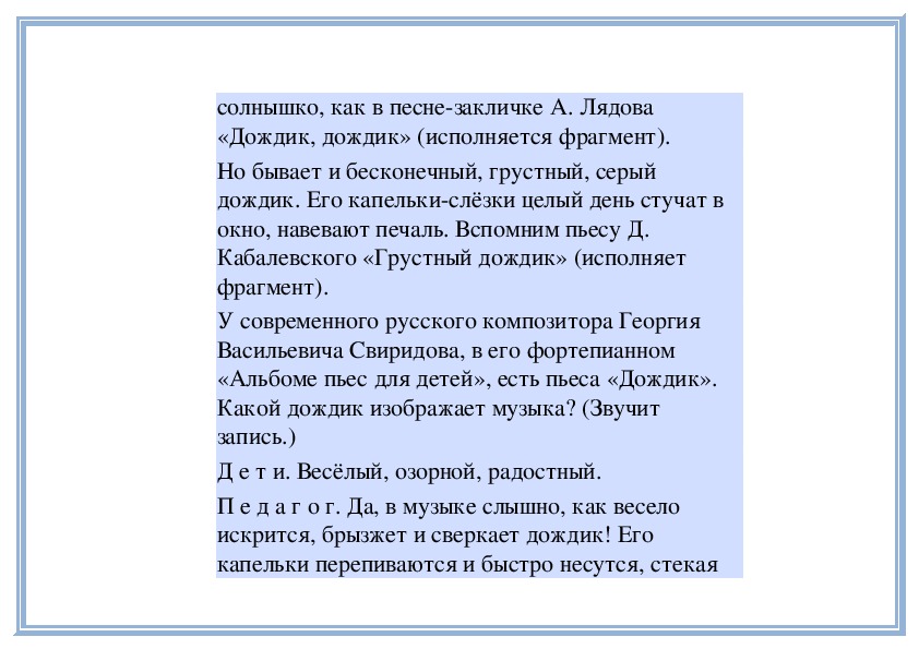 П е д а г о г. У человека в жизни бывают разные переживания - радостные и печальные, тревожные и светлые. Художник, поэт, композитор выражают свои переживания в звуках музыки, стихах, картинах. Часто какое-нибудь явление природы, например дождик, по-разному изображается в музыке, но ведь и в жизни дождик бывает разным. Он может весело и звонко накрапывать сквозь солнышко, как в песне-закличке А. Лядова «Дождик, дождик» (исполняется фрагмент).