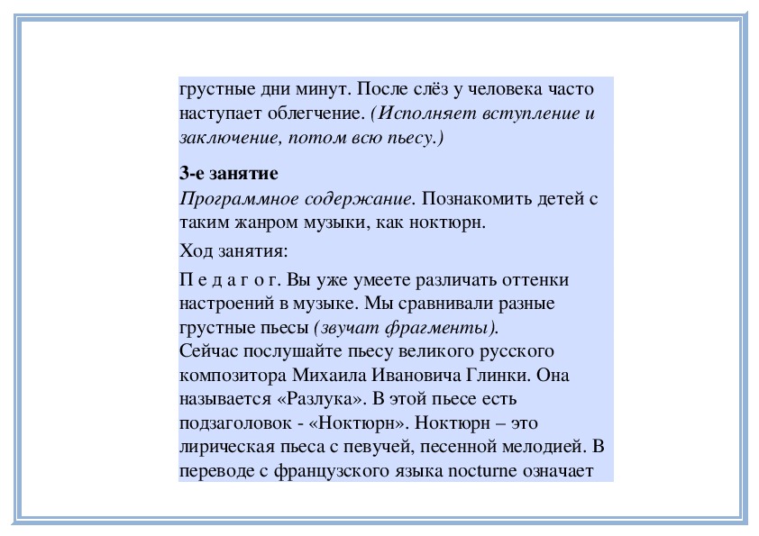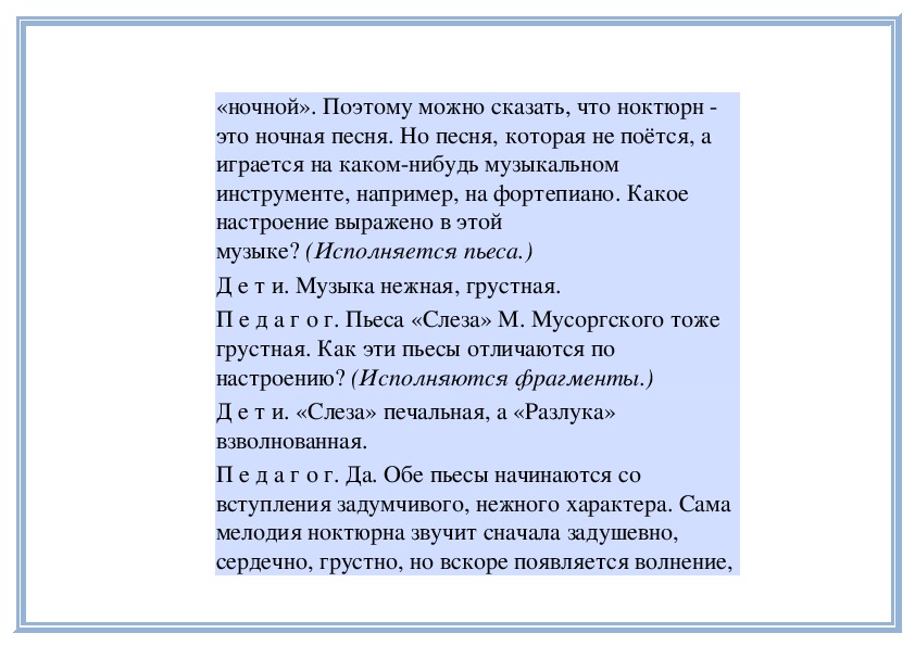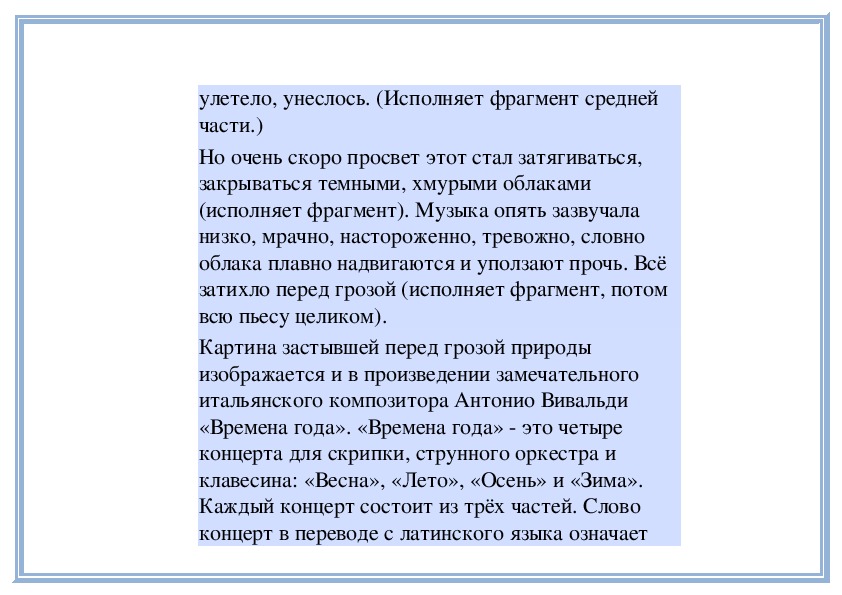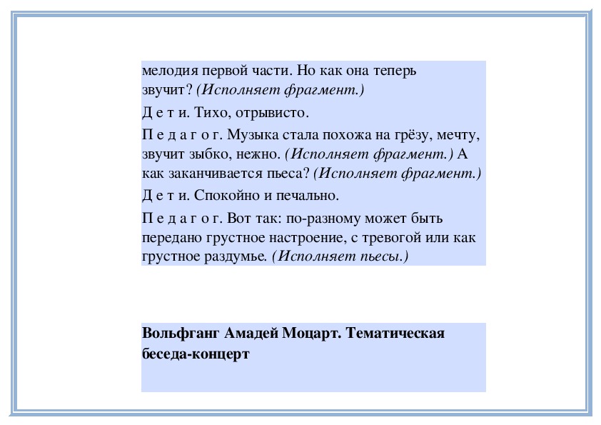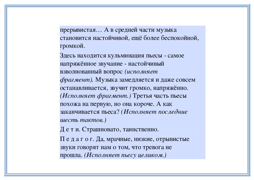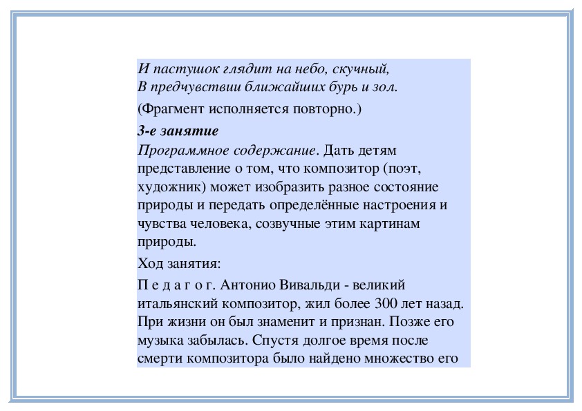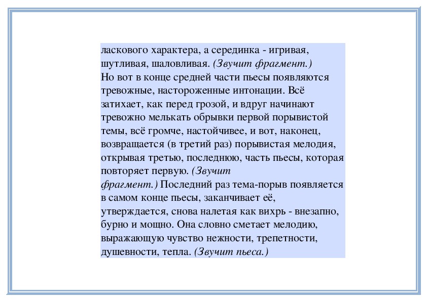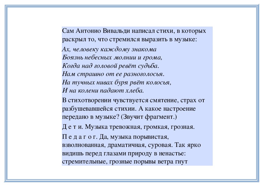 П е д а г о г. У человека в жизни бывают разные переживания - радостные и печальные, тревожные и светлые. Художник, поэт, композитор выражают свои переживания в звуках музыки, стихах, картинах. Часто какое-нибудь явление природы, например дождик, по-разному изображается в музыке, но ведь и в жизни дождик бывает разным. Он может весело и звонко накрапывать сквозь солнышко, как в песне-закличке А. Лядова «Дождик, дождик» (исполняется фрагмент).