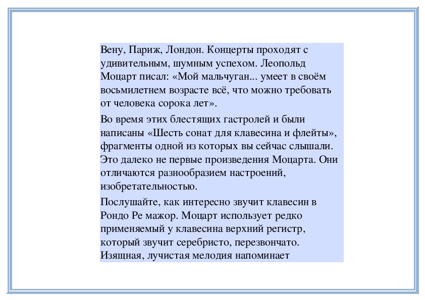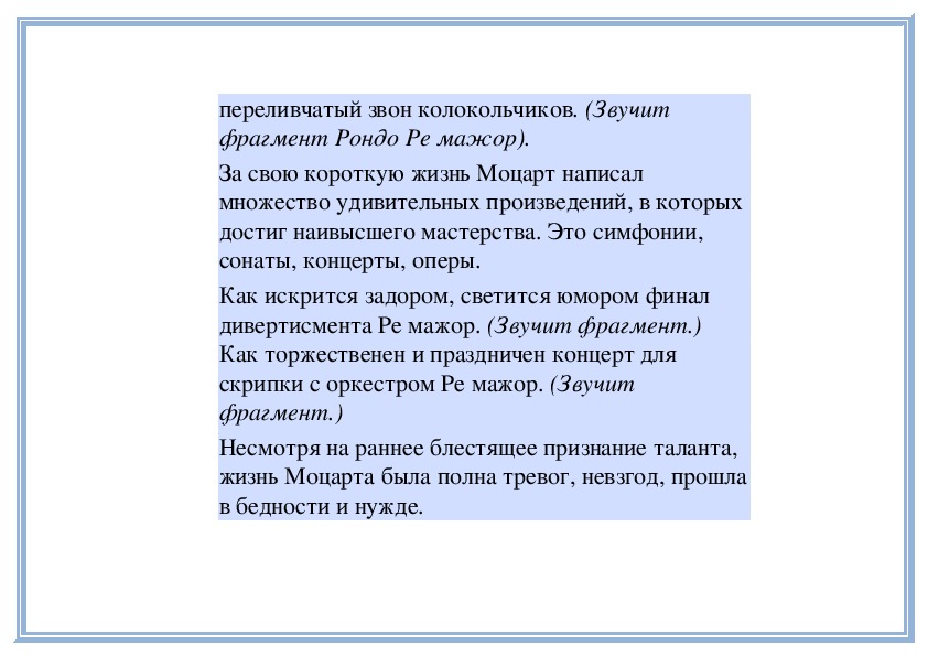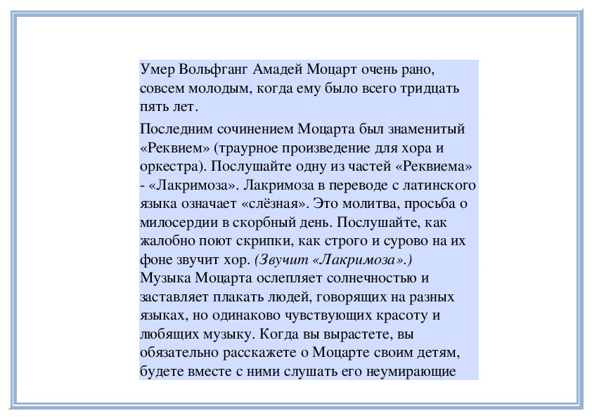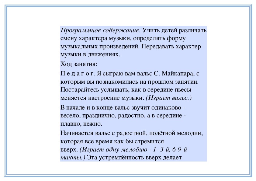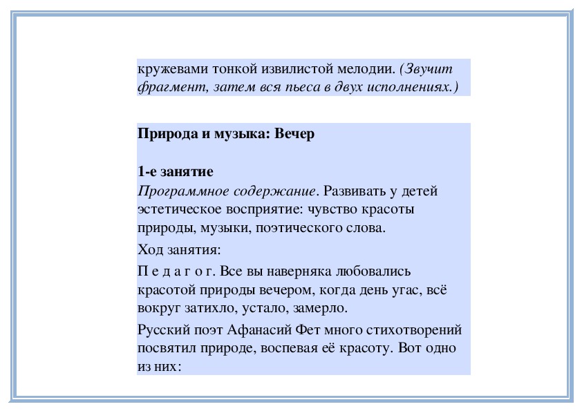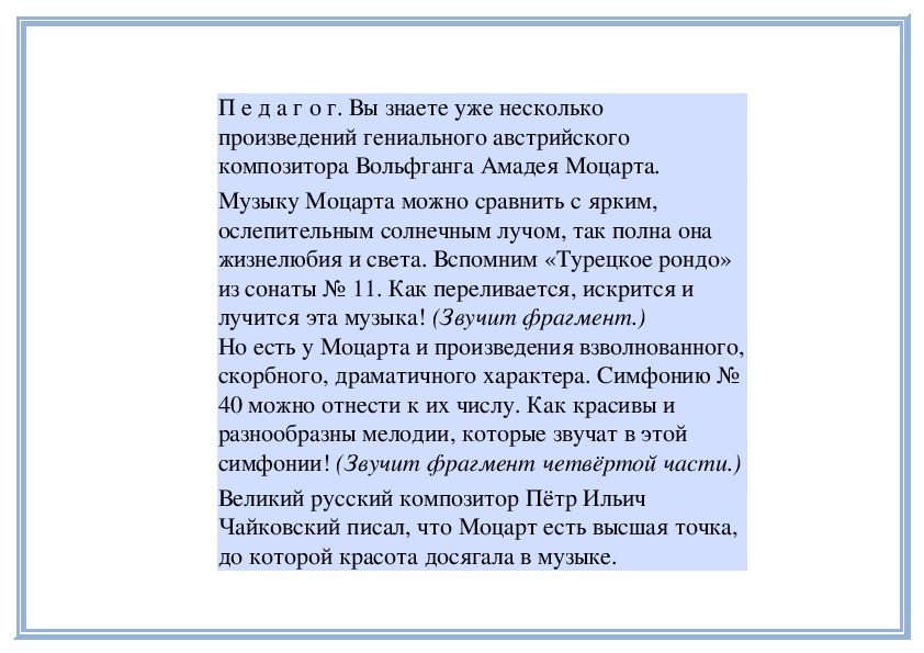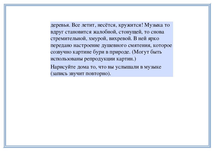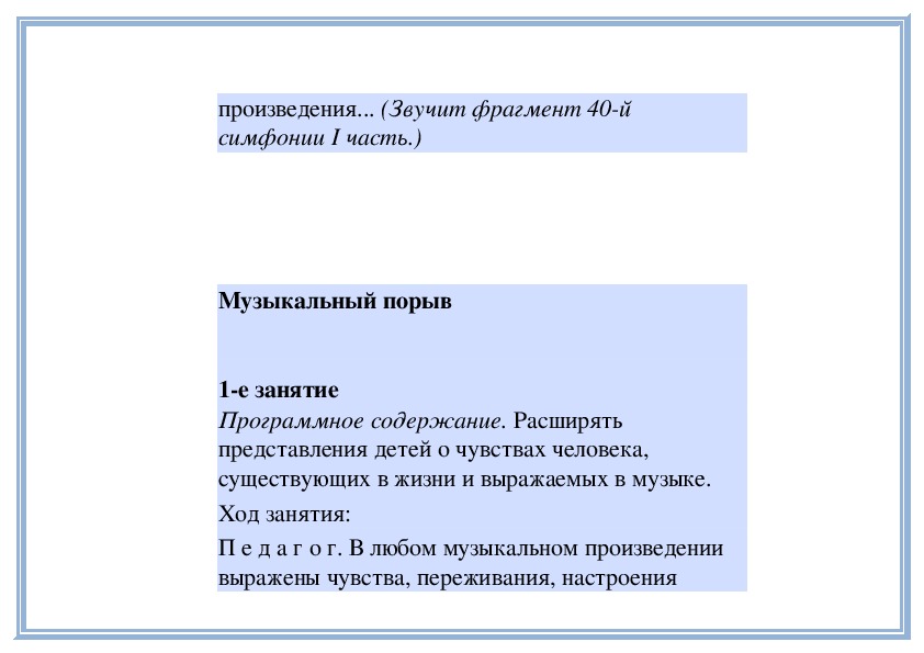 П е д а г о г. У человека в жизни бывают разные переживания - радостные и печальные, тревожные и светлые. Художник, поэт, композитор выражают свои переживания в звуках музыки, стихах, картинах. Часто какое-нибудь явление природы, например дождик, по-разному изображается в музыке, но ведь и в жизни дождик бывает разным. Он может весело и звонко накрапывать сквозь солнышко, как в песне-закличке А. Лядова «Дождик, дождик» (исполняется фрагмент).