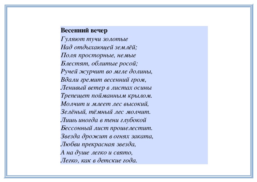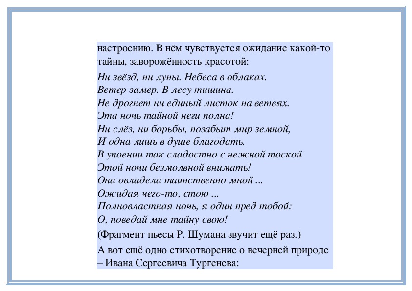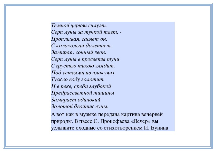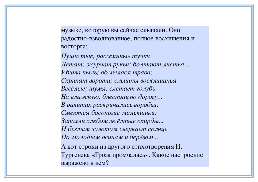 Настроение, переданное в этих строках, созвучномузыке, которую вы сейчас слышали. Оно