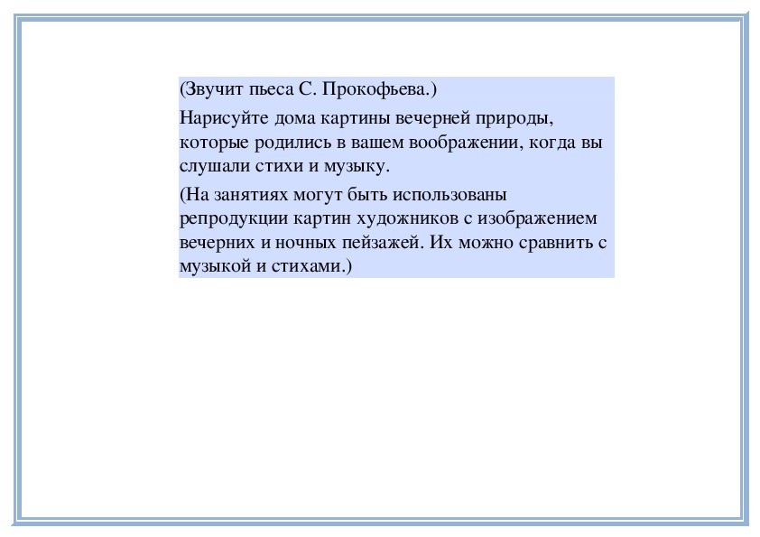 Программное содержание. Учить детей сравнивать произведения с похожими названиями, различать оттенки настроений в музыке, стихах, картинах.