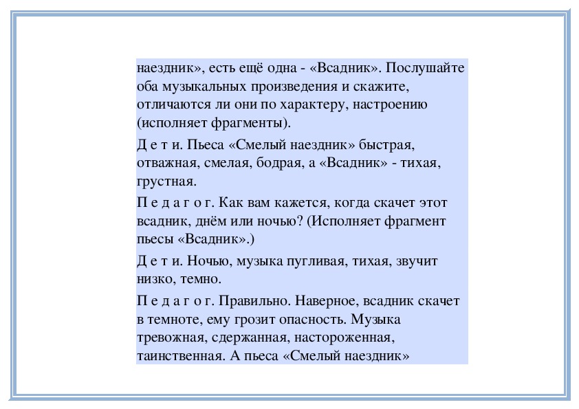 таинственная. А пьеса «Смелый наездник»решительная, устремлённая. Посмотрите на эти