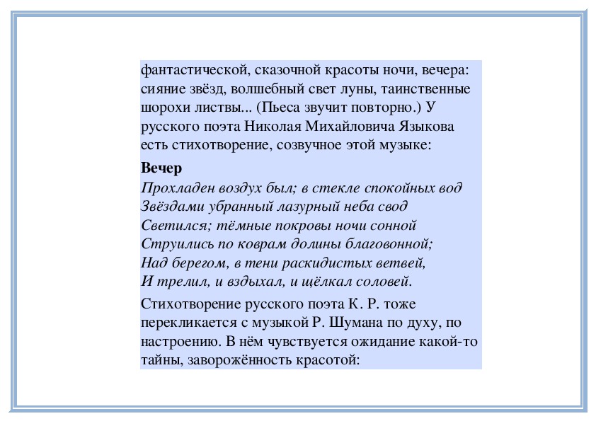 сравним её с другой пьесой, композитора РобертаШумана, с похожим названием «Вечером». Какая
