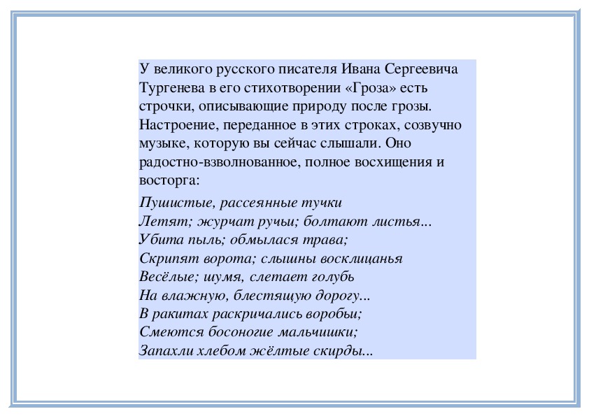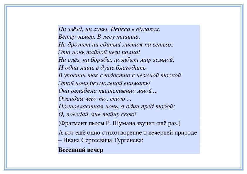Многие поэты, художники, музыканты восторгались красотой вечерней или ночной природы. В звуках, красках, словах они по-своему выражали свои чувства, изображали дивные, таинственные картины засыпающей вечерней природы. Вот ещё одно стихотворение. Его написал Иван Алексеевич Бунин - русский писатель и поэт: