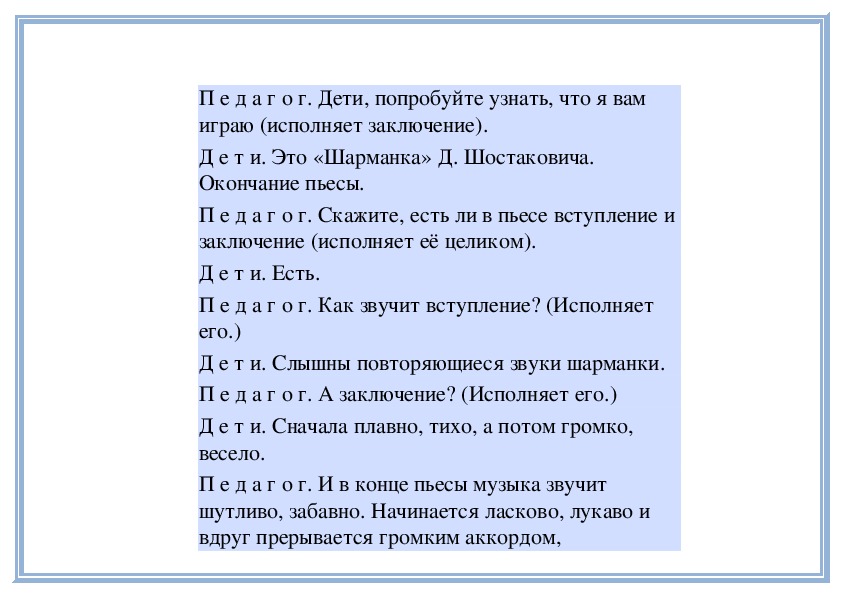 П е д а г о г. И в конце пьесы музыка звучит