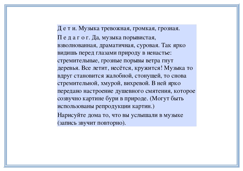 Д е т и. Спокойная, нежная, задумчивая.П е д а г о г. Да, музыка задушевная, ласковая. Она