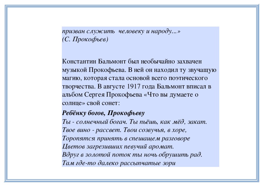 В 1915 году Сергей Прокофьев сблизился с Константином Дмитриевичем Бальмонтом - популярнейшим русским поэтом. Бальмонт был одним из зачинателей нового направления в литературе - символизма. Поэтический мир поэта - мир тончайших мимолётных наблюдений и хрупких чувствований, мир «солнечности» и стремления к постоянному обновлению - оказался близок творчеству молодого композитора. Близок оказался Прокофьеву и мистицизм, занимавший столь большое место в воззрении поэта.