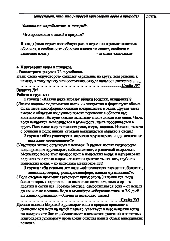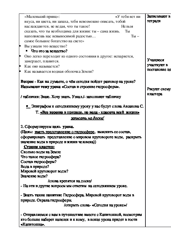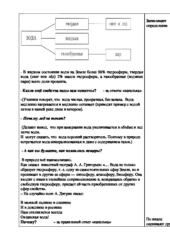 Познавательная задача - раскрыть понятие «гидросфера», «мировой круговорот воды», продолжить формирование представления о ритмичности процессов гидросферы, ее связи с другими оболочками, сформировать представление о круговороте воды во всех оболочках Земли; научить описывать гидросферу и круговорот воды по рисунку, диаграммам.