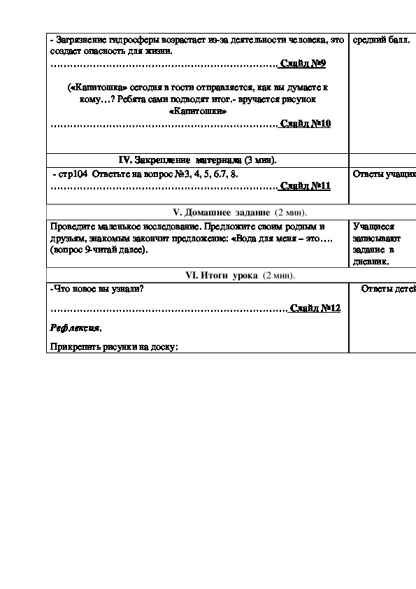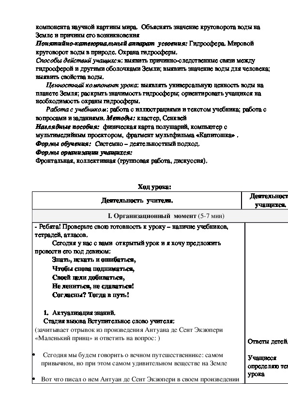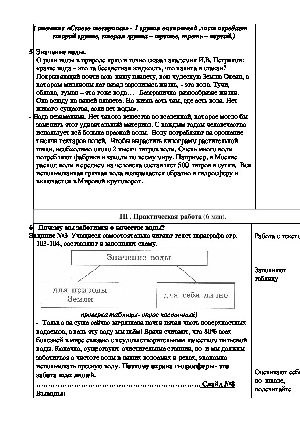 Воспитательная задача – раскрыть значение воды в природе и жизни каждого человека; продолжить развитие учебно-коммуникативных умений и навыков: участвовать в совместной деятельности, учебном диалоге.конспект
